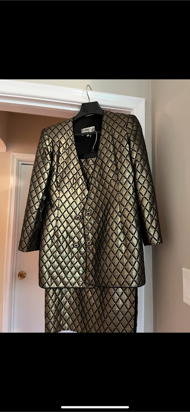 Selling a beautiful two-piece skirt suit from Stefania! It features a unique gold and black diamond pattern. Perfect for a special occasion or adding some flair to your wardrobe