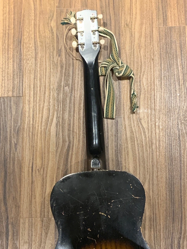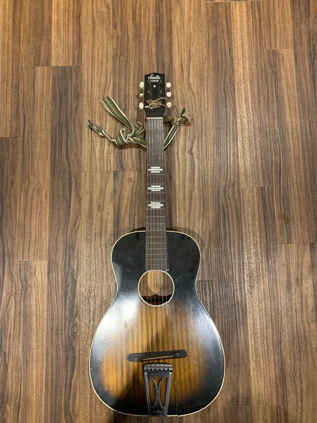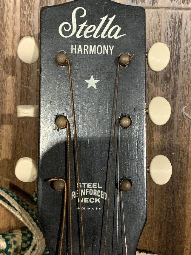 Check out this vintage Stella Harmony guitar, a real piece of musical history! This old guitar is a parlour size, with a steel reinforced neck, That as you can see requires some repair. Great for anyone who wants a project. But body is solid.