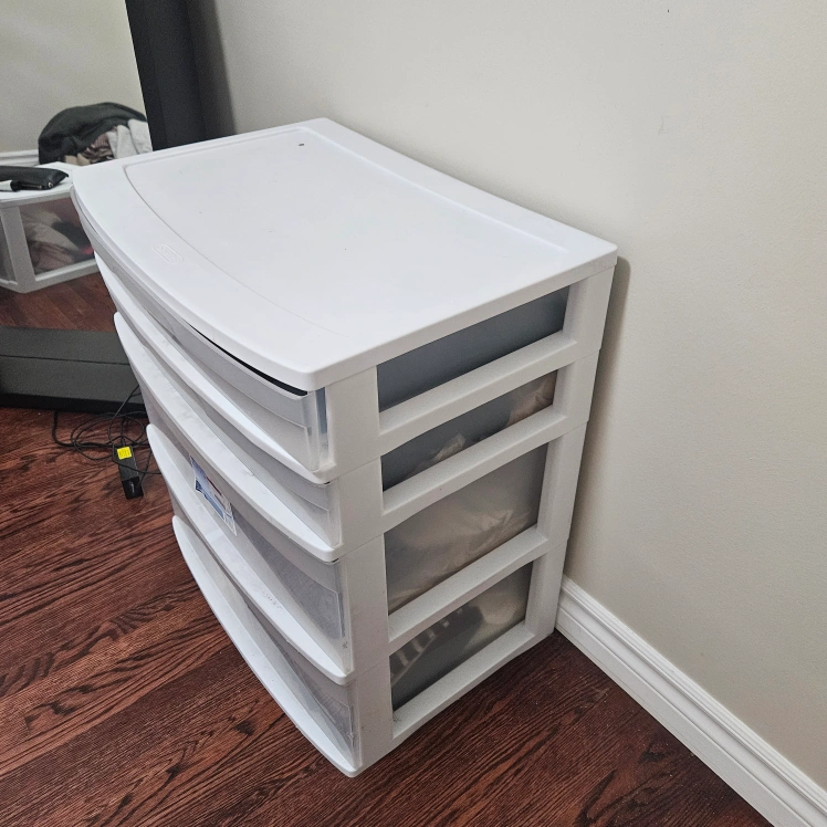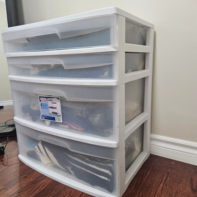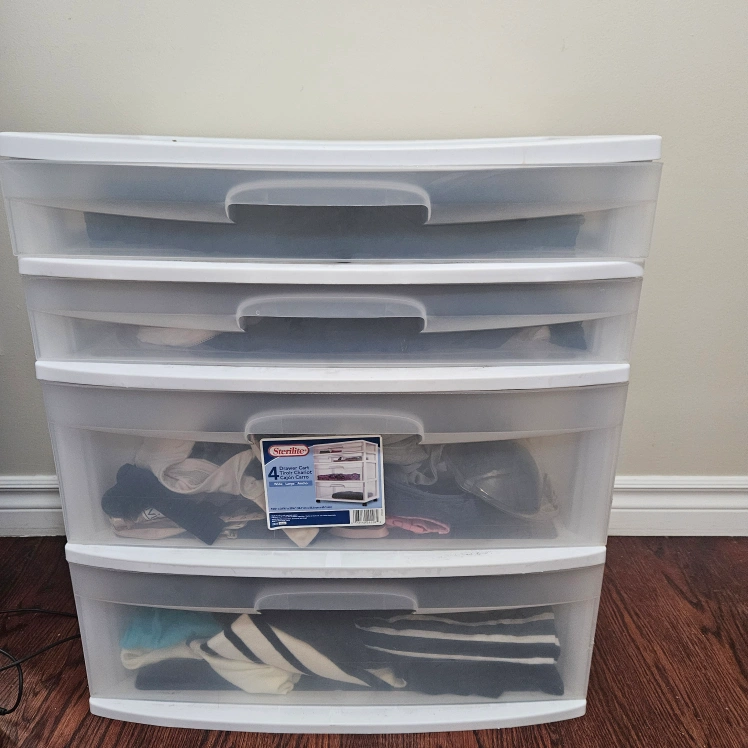 I'm selling a Sterilite 4-drawer wide tower. It's great for organizing clothes, toys, or anything else you need to store. It's in good condition and ready for a new home!