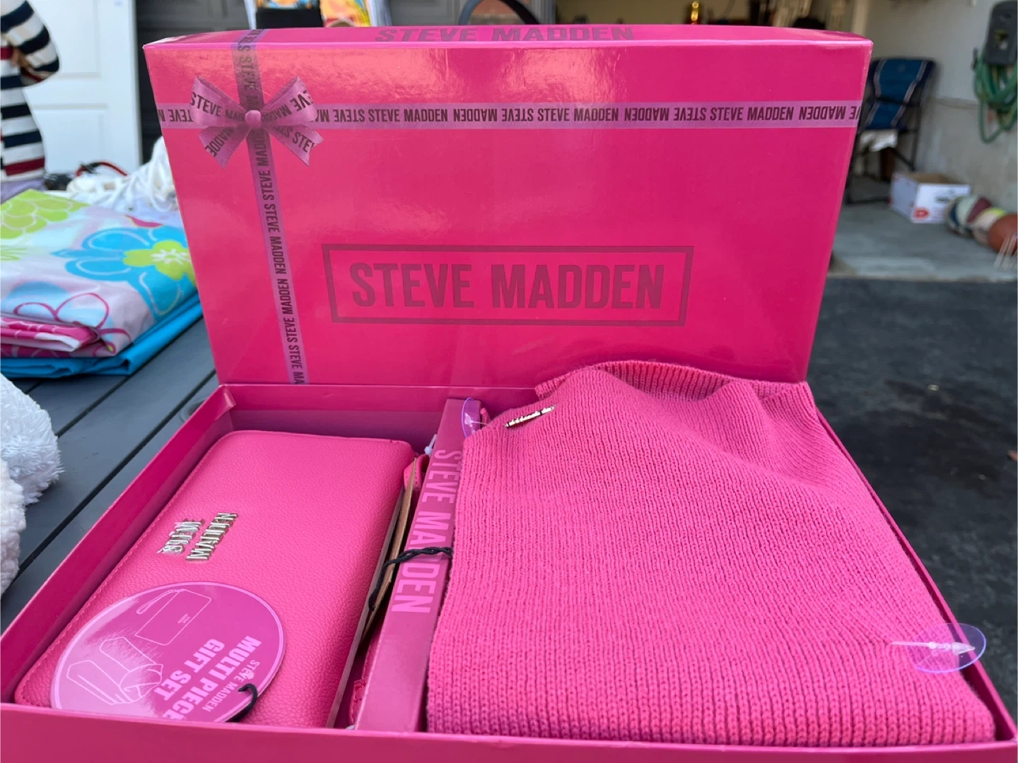 Brand new Steve Madden multi piece gift set in a vibrant pink! This set includes a wallet and a scarf, perfect for adding a pop of colour to your wardrobe. Comes in the original box, making it a great gift option too