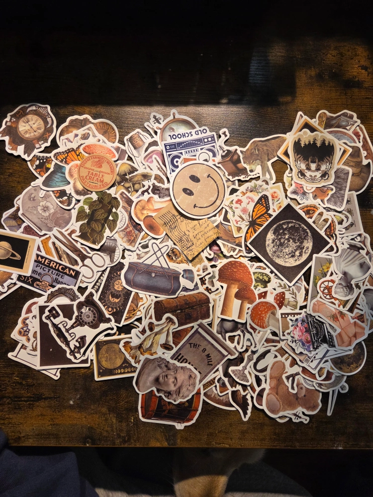 I have a ton of random stickers for sale, most with a vintage vibe. Clocks, butterflies, mushrooms, crystals, space, plants. There's at least 200!