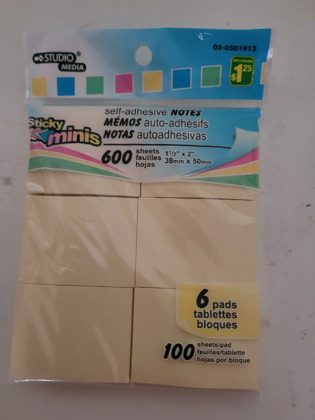 I'm giving away a pack of Sticky Minis self-adhesive notes. This pack includes 6 pads, each with 100 sheets. The size of each sheet is 1 1/2" x 2" (38mm x 50mm). Great for quick notes and reminders!