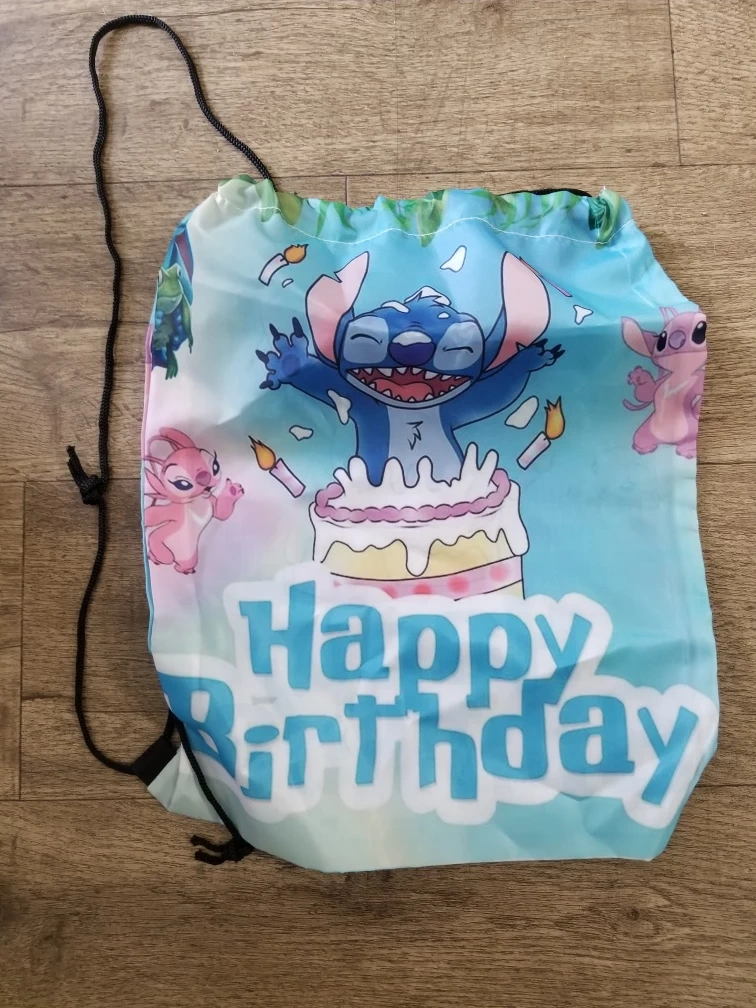 This is a cute drawstring bag with a Stitch and Angel design, perfect for a birthday celebration! It features Stitch and Angel with a birthday cake and the words "Happy Birthday" printed on it. The bag is lightweight and easy to carry, making it great for kids or anyone who loves Stitch! Brand new