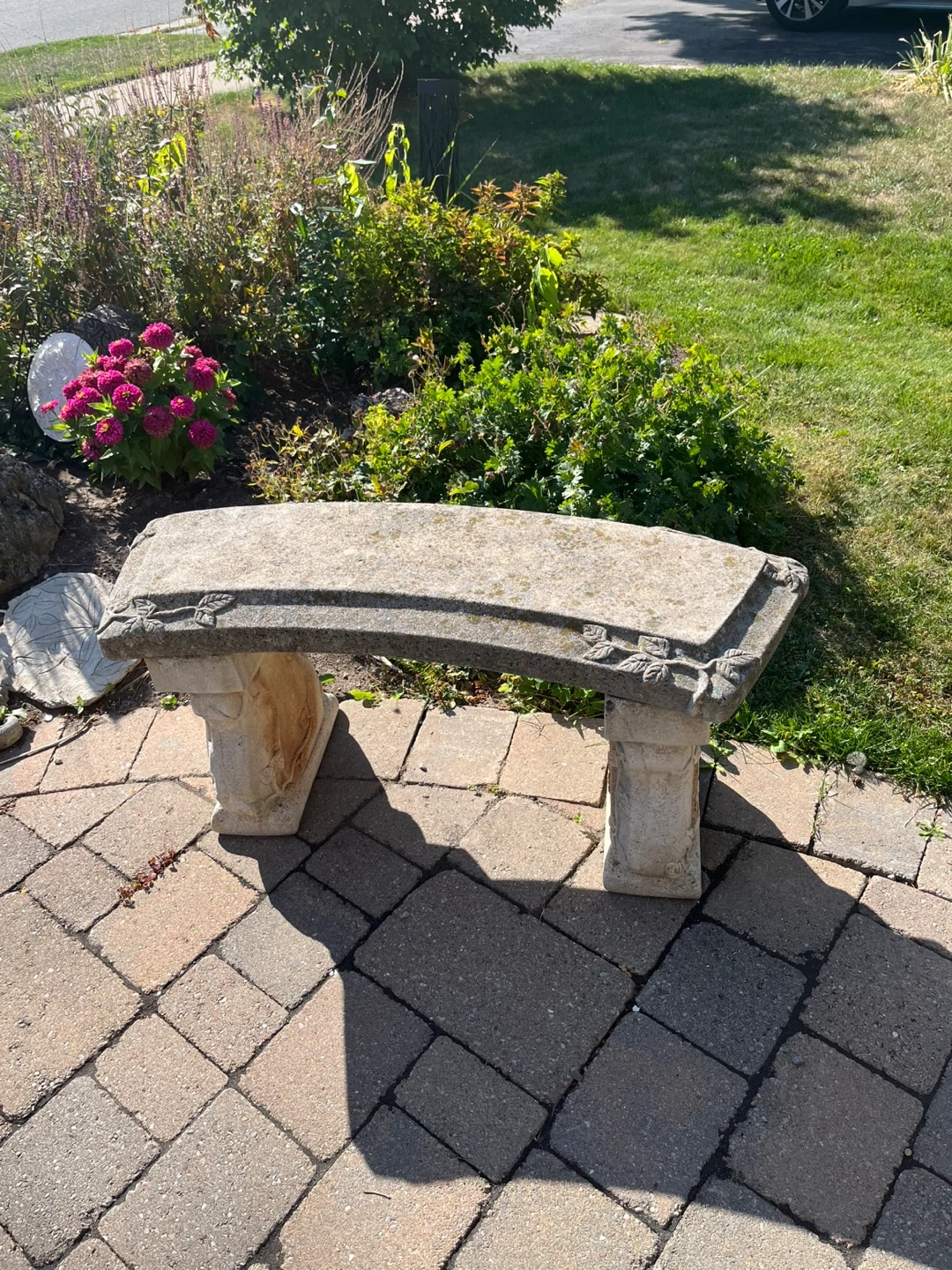 Selling a stone garden bench. It's perfect for adding a touch of elegance to your outdoor space. It looks great in any garden!