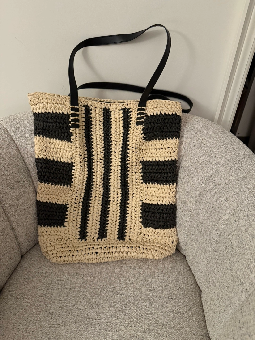Selling a cute straw tote bag with black and beige stripes! It's in great condition and perfect for summer outings or a day at the beach. The handles are black, adding a nice contrast to the natural straw material