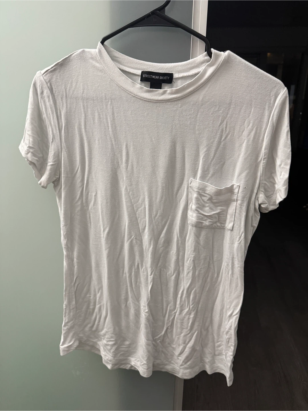 A simple and stylish white tee from Streetwear Society. It's in great condition and ready for a new home! Perfect for everyday wear and casual outings, this tee features a classic design with a pocket detail. It's a versatile piece that can be easily paired with jeans, shorts, or skirts or just something to wear at home. I have only worn it once and it’s been washed and in my closet since.
