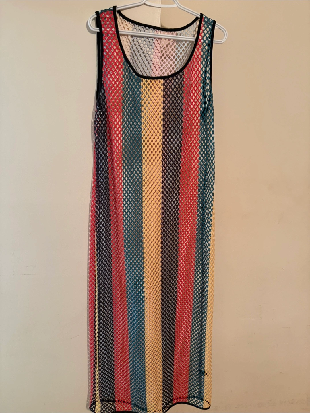 Selling a colourful striped net dress! It's in great condition and features stripes of red, teal, yellow, and black. Perfect for layering or wearing on its own! Never worn Smoke and pet free house Xxl