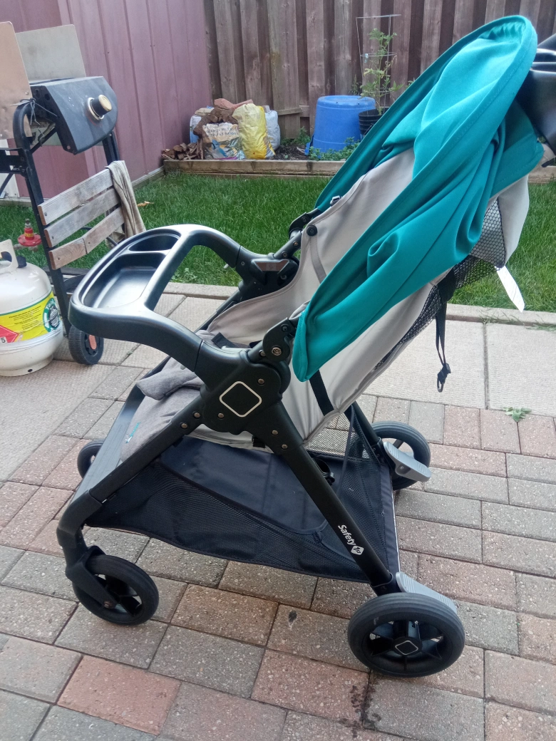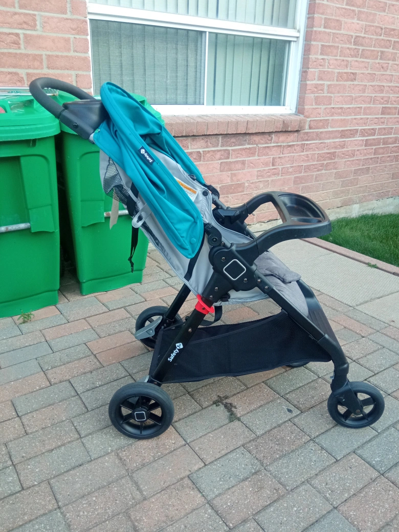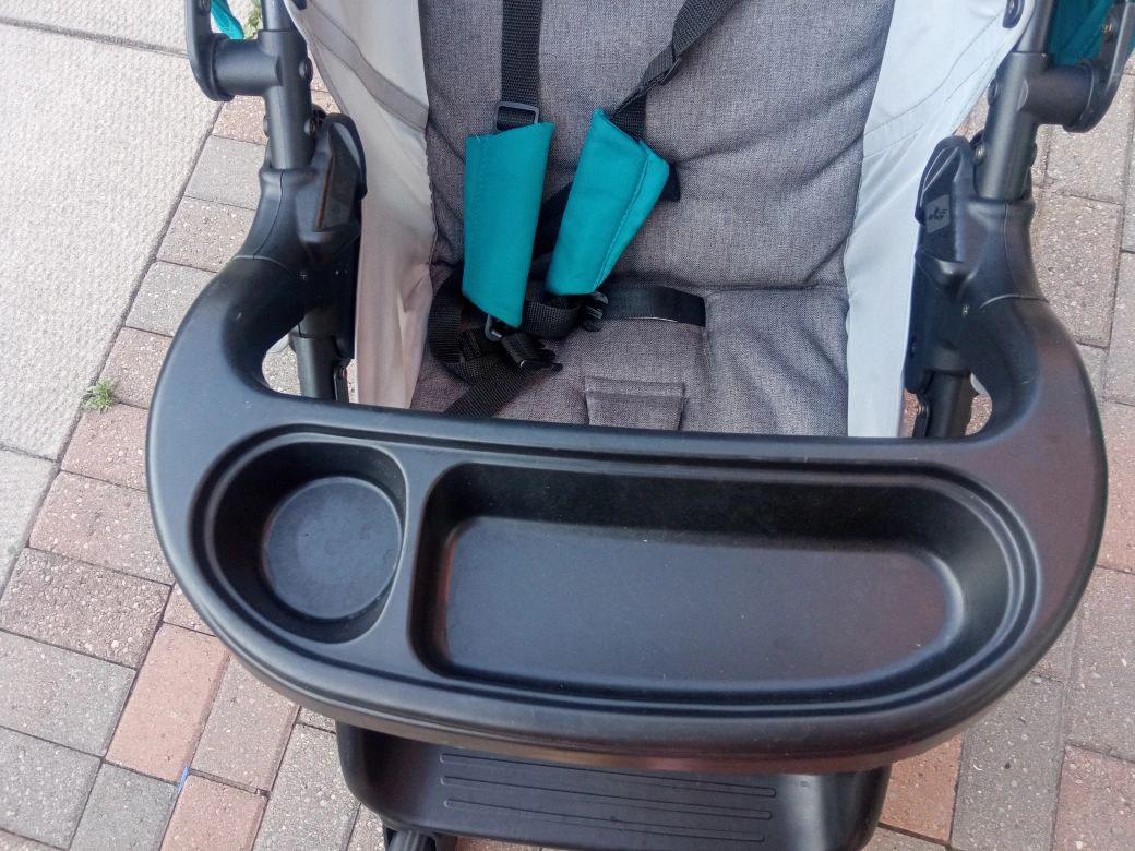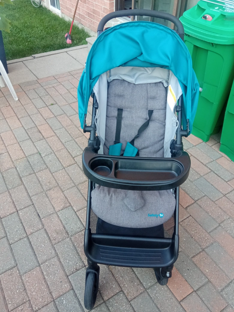 Safety Single Stroller in teal and grey. It has a tray for drinks and snacks and a sun canopy. It also includes a footrest. It's durable and strong and in a good condition.