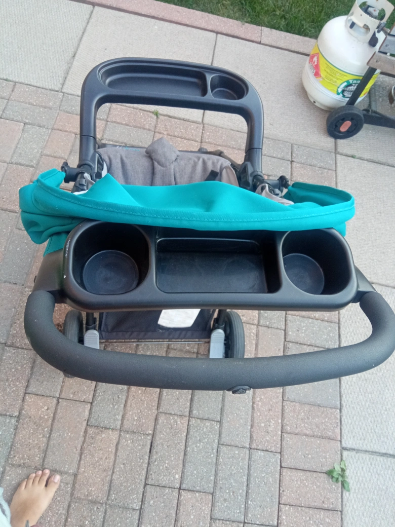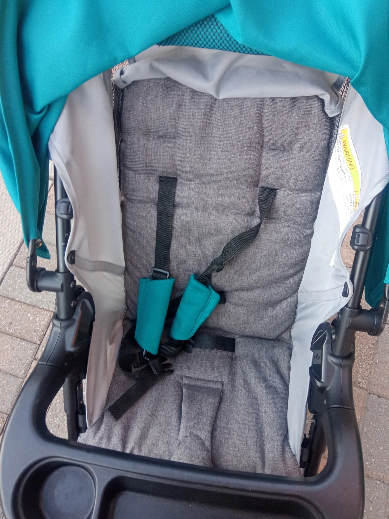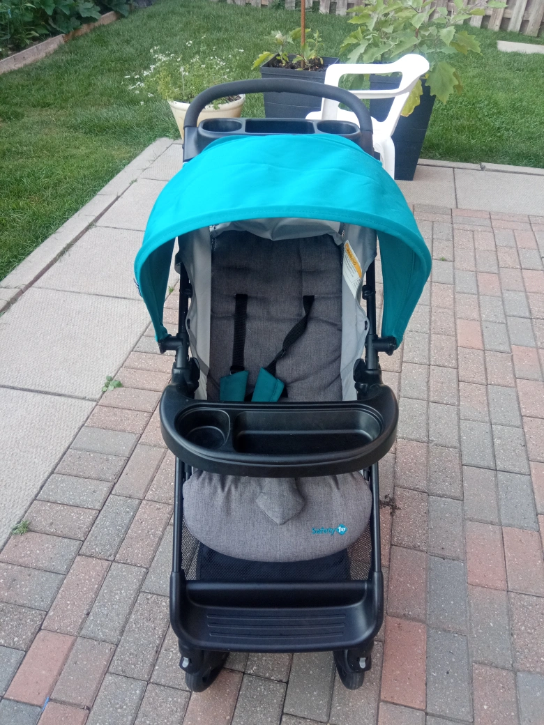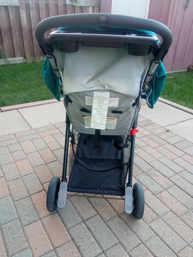 Safety Single Stroller in teal and grey. It has a tray for drinks and snacks and a sun canopy. It also includes a footrest. It's durable and strong and in a good condition.