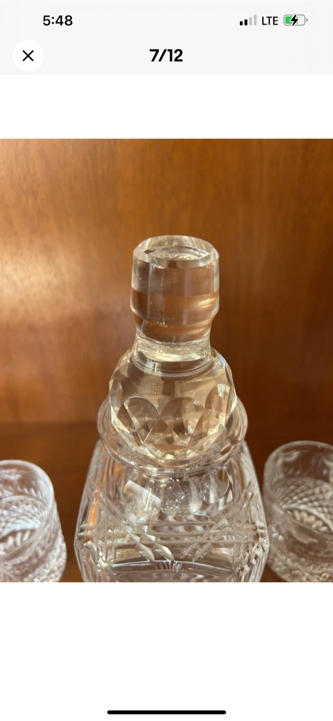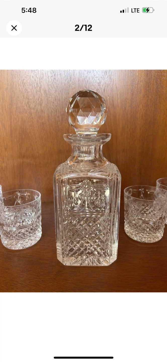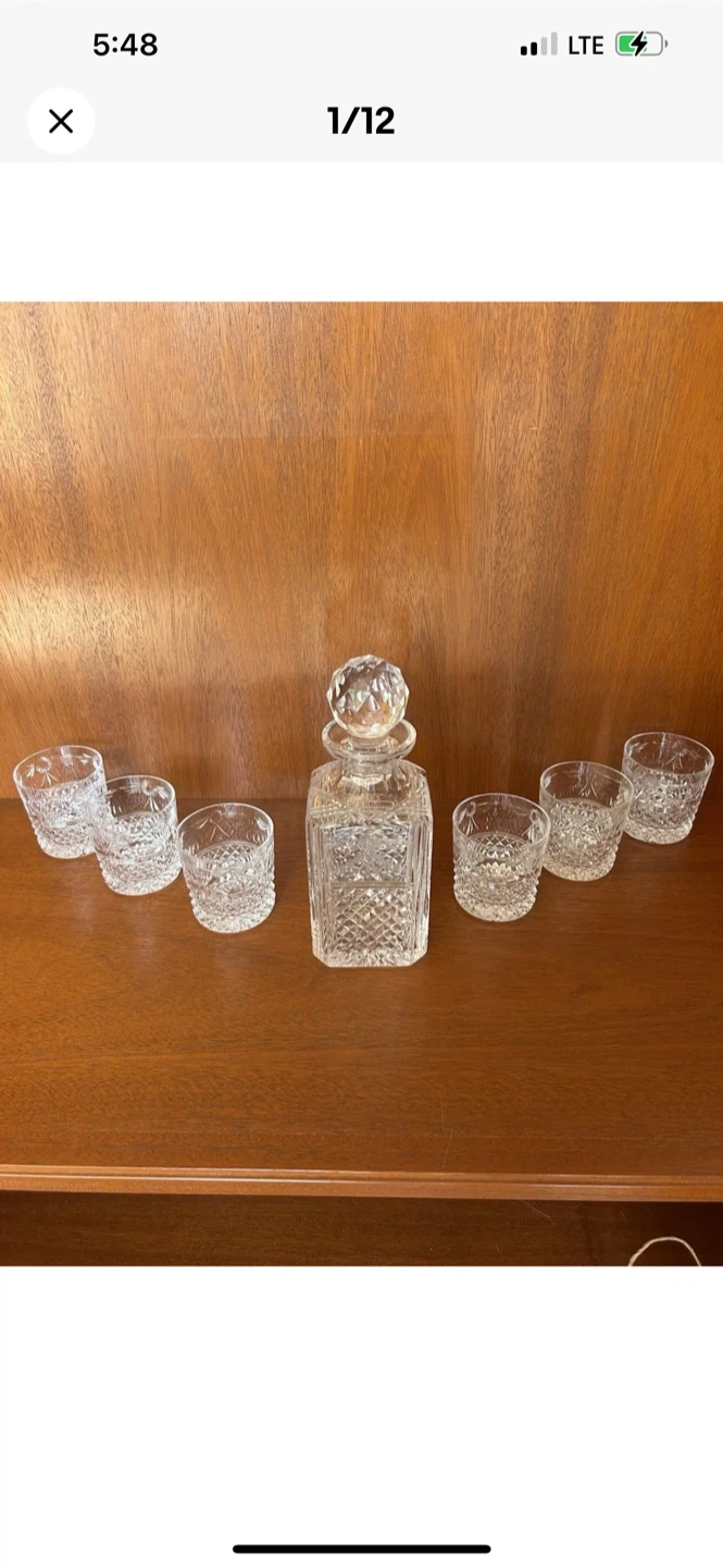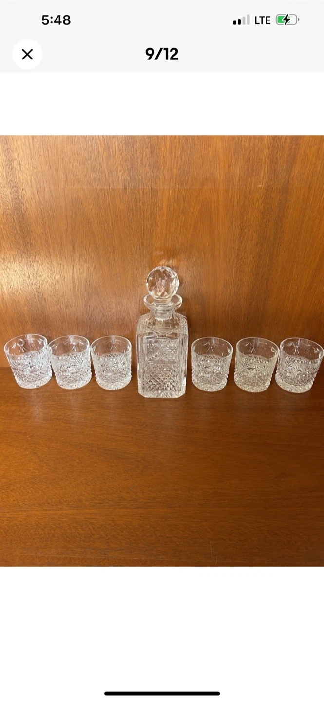 Selling a beautiful crystal decanter with 6 matching glasses! The set features an intricate cut-glass design. Perfect for adding a touch of elegance to your home bar or dining area