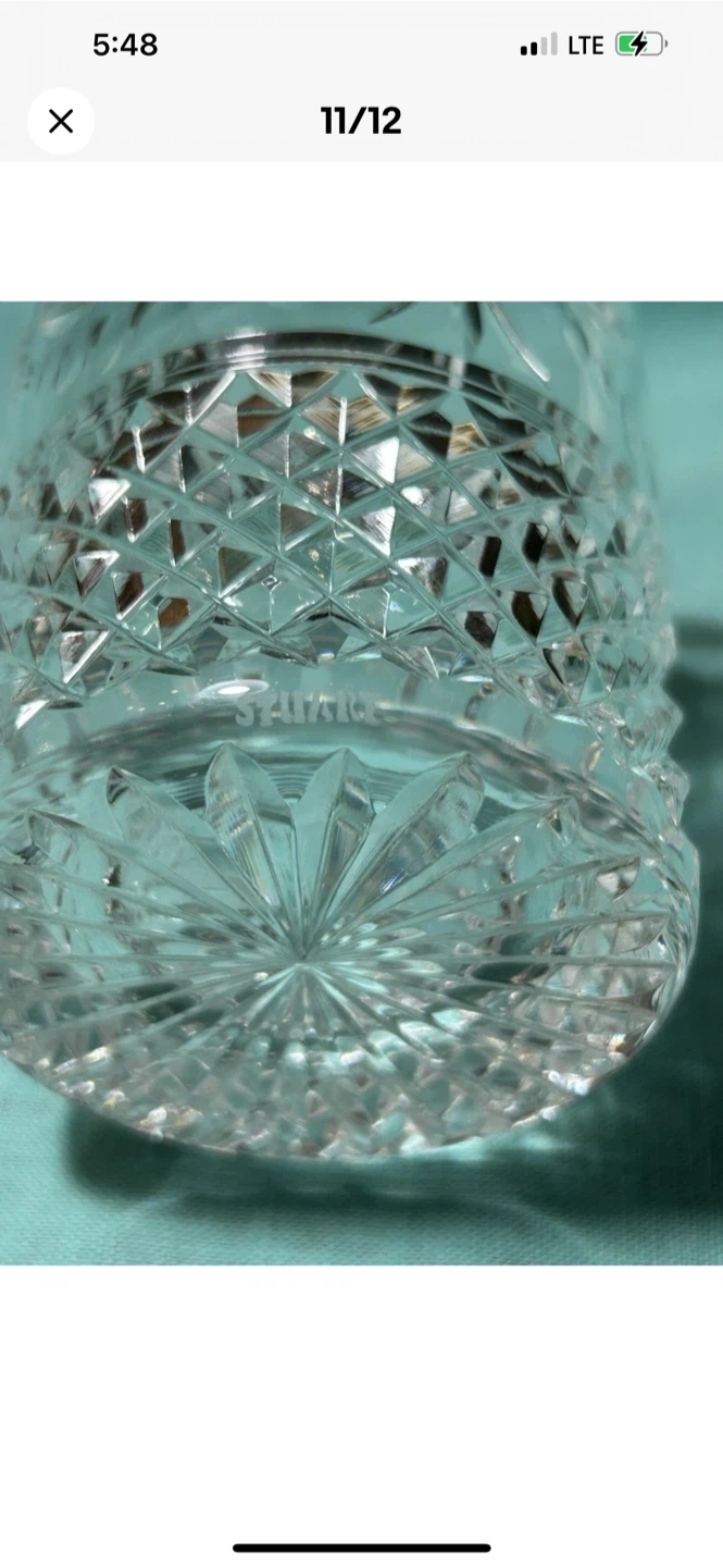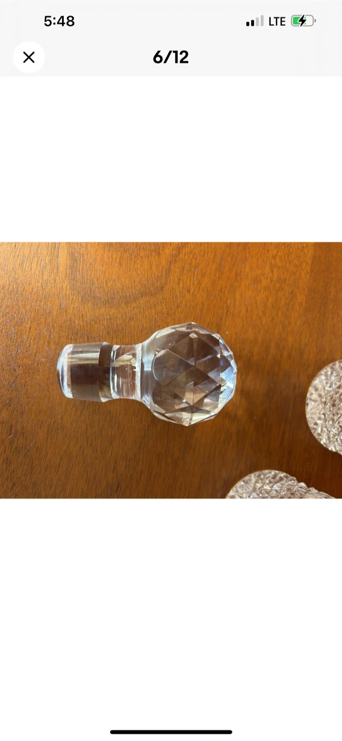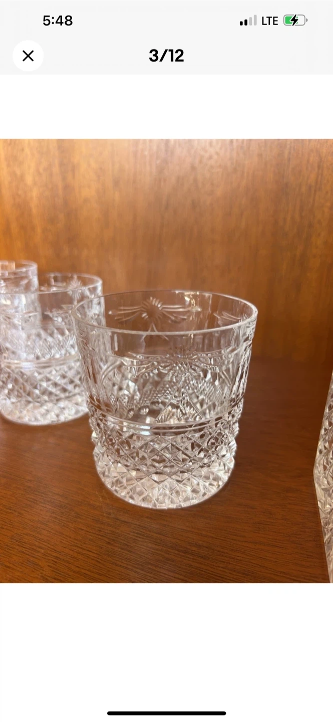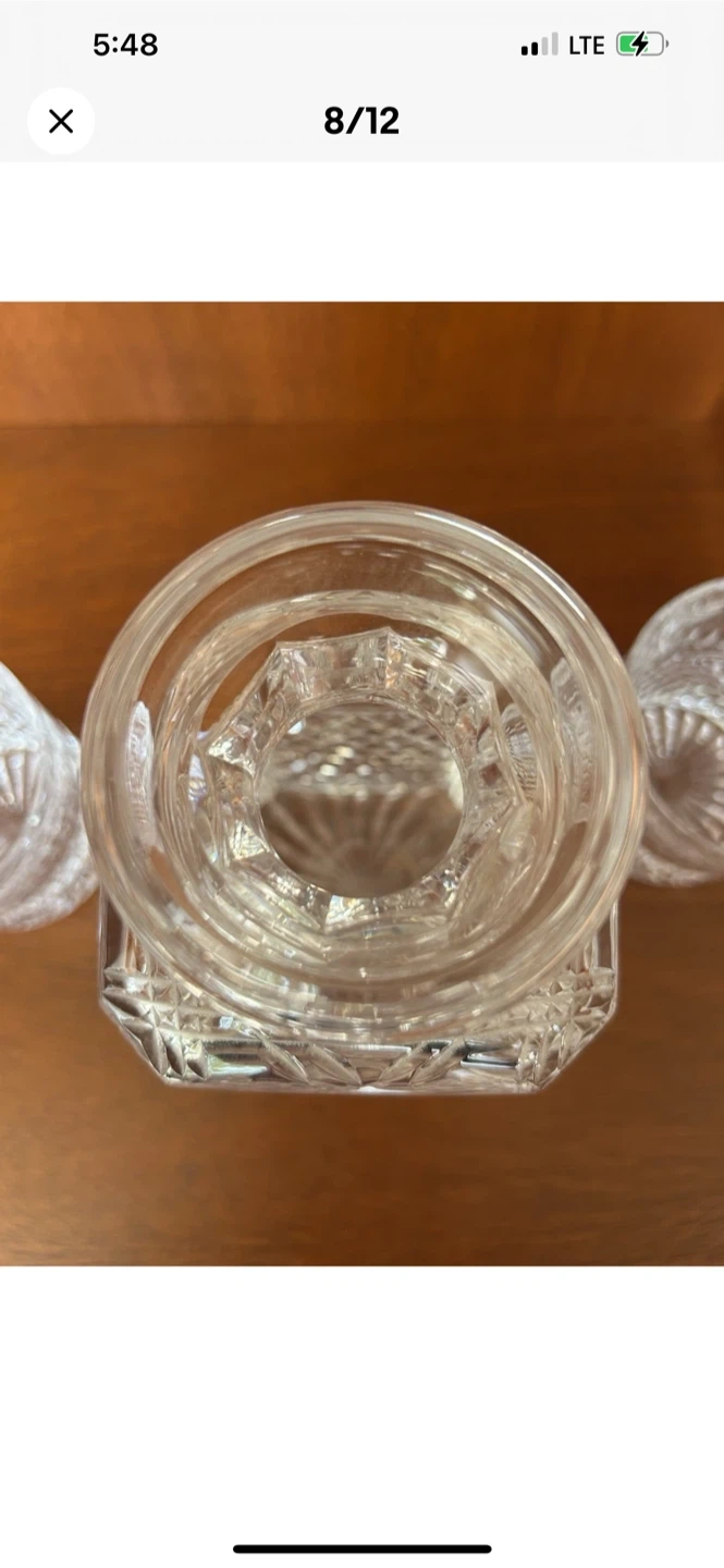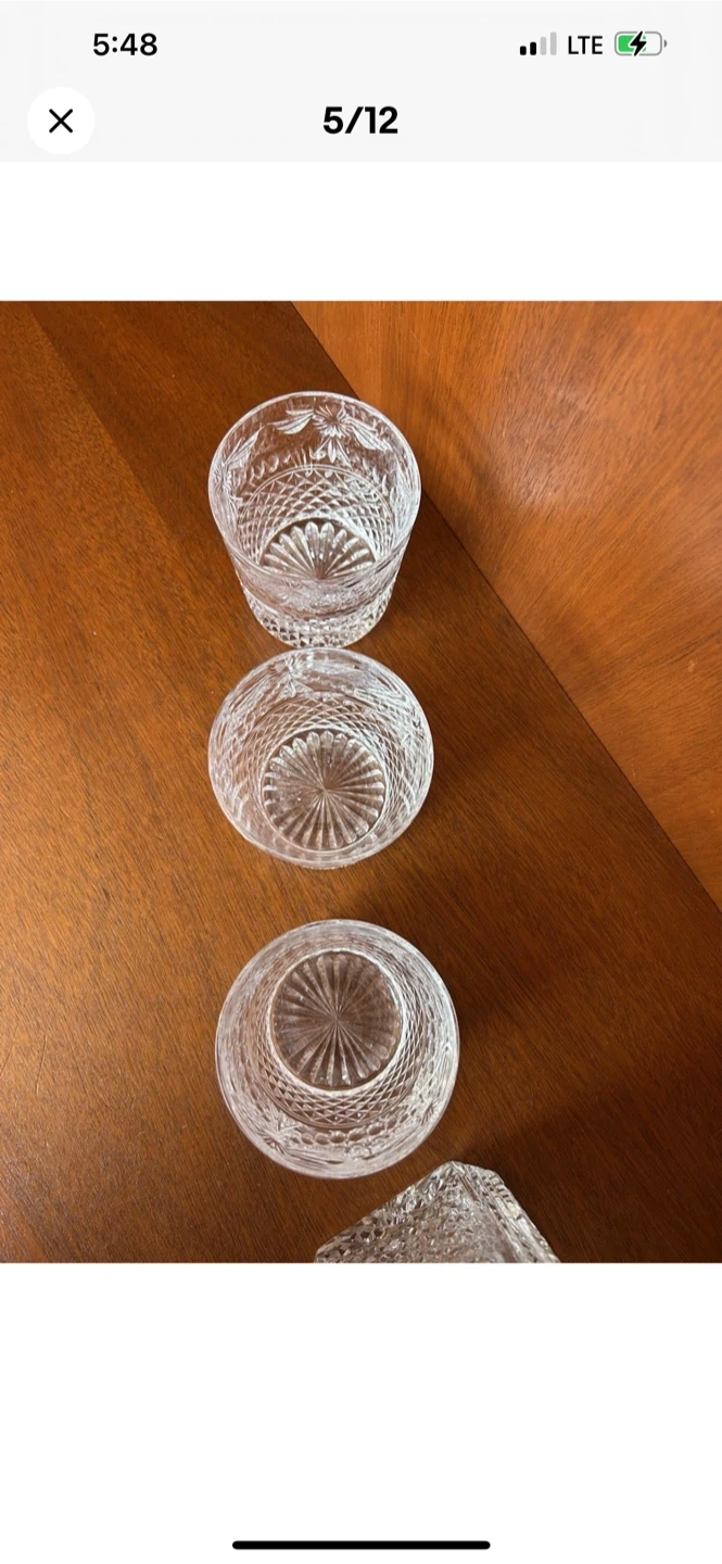 Selling a beautiful crystal decanter with 6 matching glasses! The set features an intricate cut-glass design. Perfect for adding a touch of elegance to your home bar or dining area
