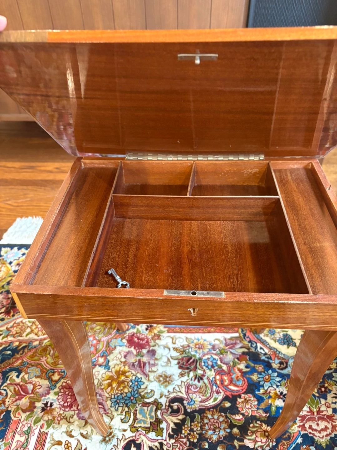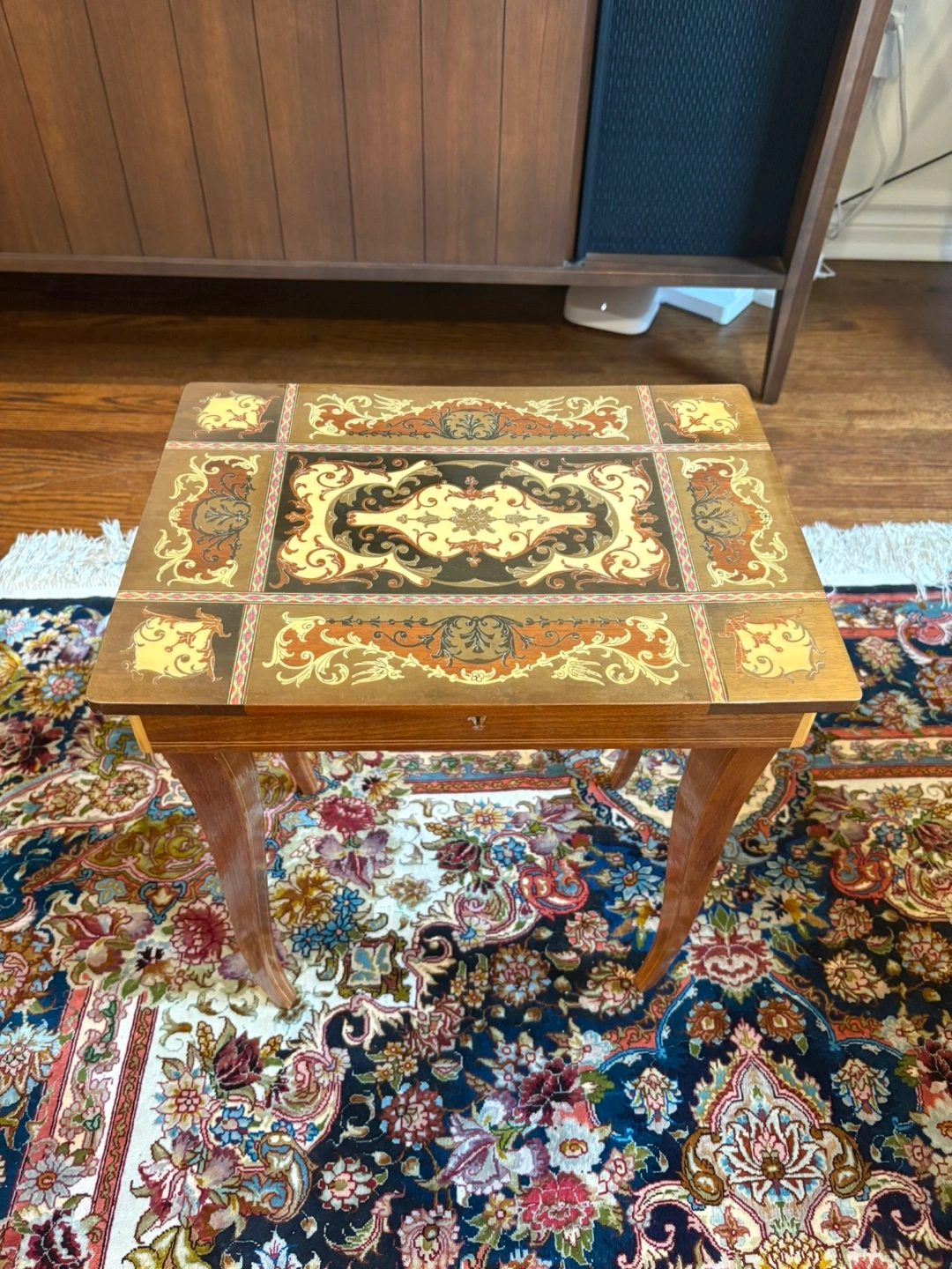 Stunning Italian Music Table with hinged, inlaid top. Complete with key. Swiss movement wind up music box in very good working condition. Plays the famous classical music, Torna A Sorriento.