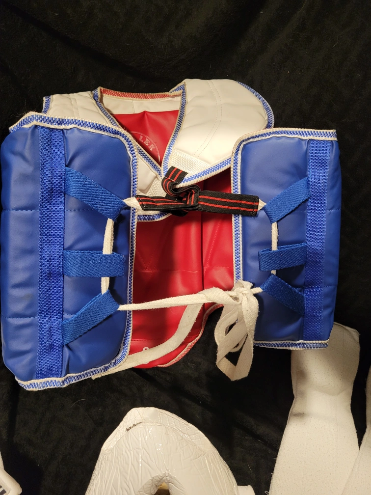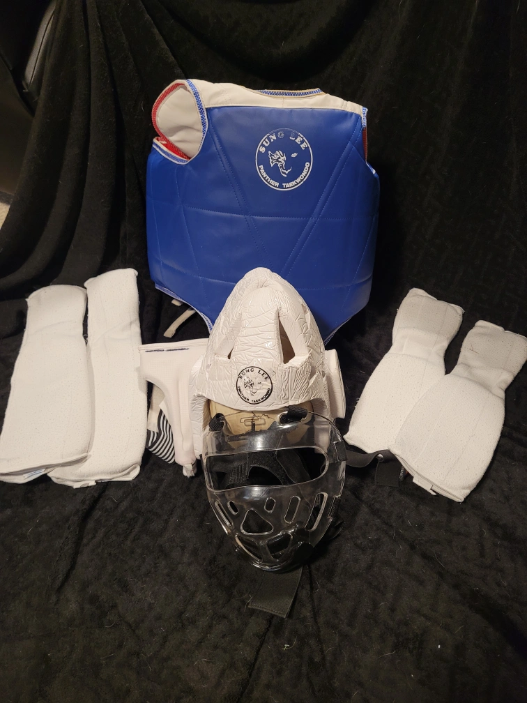 Selling a complete set of Sung Lee Taekwondo gear! Includes a chest protector, headgear, face shield, gloves, and foot protectors. Perfect for anyone starting out or needing a replacement set. All items are in used conditions but in very good shape.