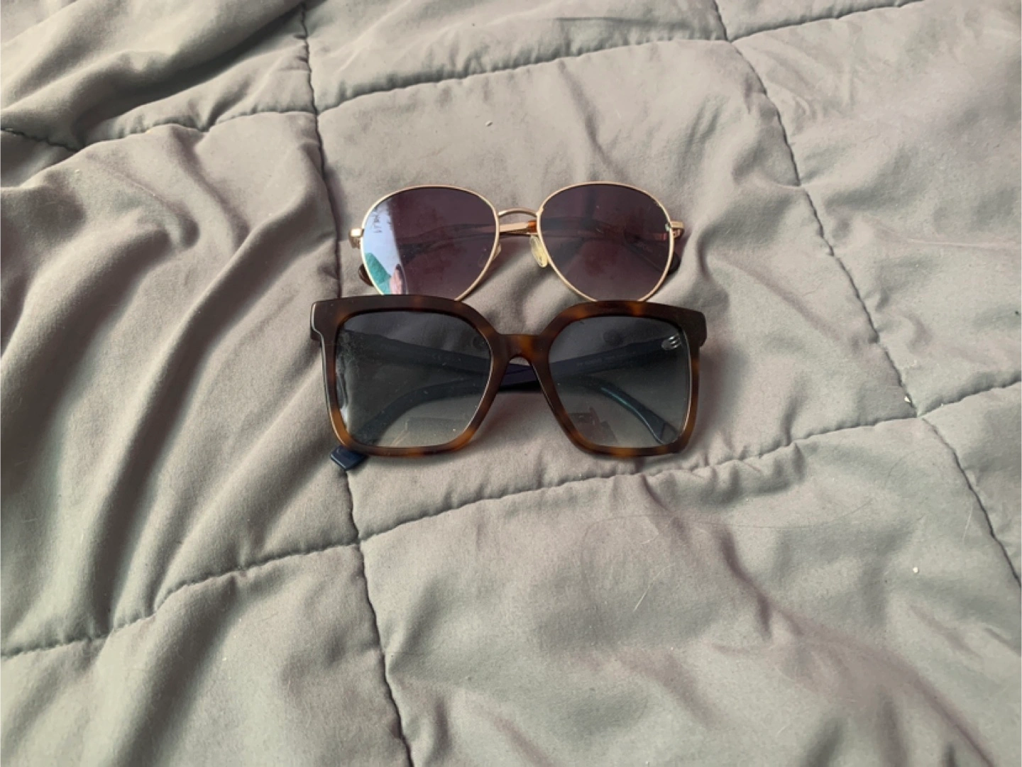Selling two pairs of sunglasses! One pair has gold frames, and the other has a tortoise shell pattern. Both are in good condition and ready for a new home