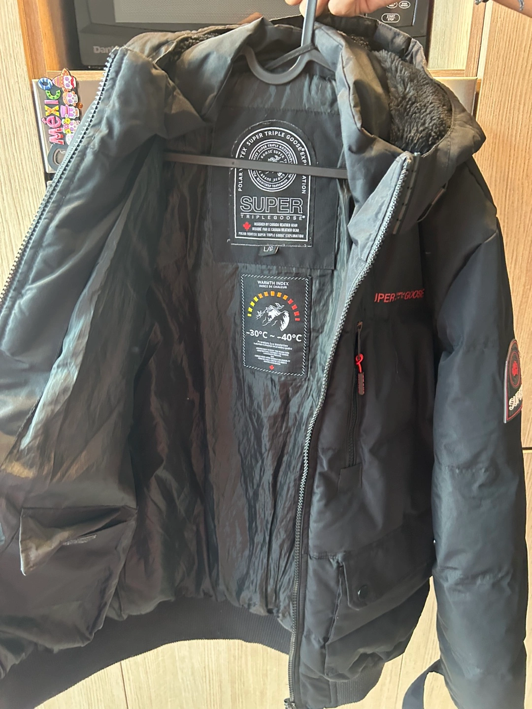 Selling a Super Triple Goose winter jacket, perfect for those cold Canadian days! It's a size L/G and designed by Canada Weather Gear. The jacket has a warmth index indicating it's suitable for temperatures between -30°C and -40°C. Stay warm and stylish this winter! Bought for 350$+ New jacket worn twice. Pick up bay and temperance