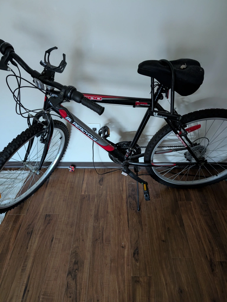Selling a Supercycle Venture mountain bike. It has a black and red frame. It is a 26 inch bike. Great for trails or just getting around town