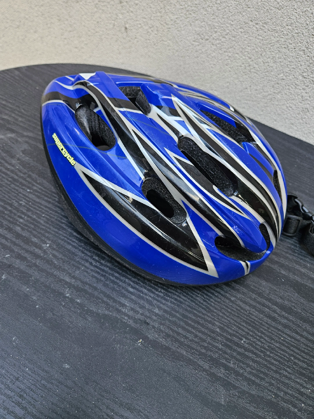 Selling a Supercycle youth helmet in blue and black. It's in good condition and sized for youth, fitting head circumferences of 54-58cm. Perfect for biking, skating, or scootering!