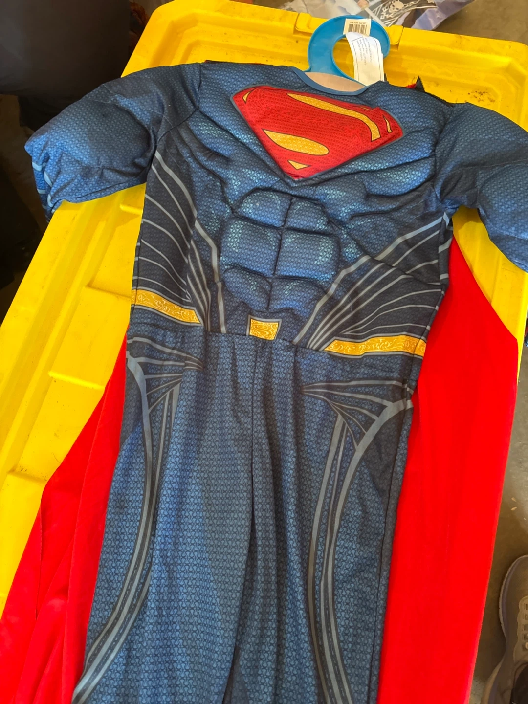 Selling a Superman costume, perfect for dress-up or Halloween! It's in great condition and includes the cape. The costume features the classic Superman logo and design. Ready for a new superhero in training!