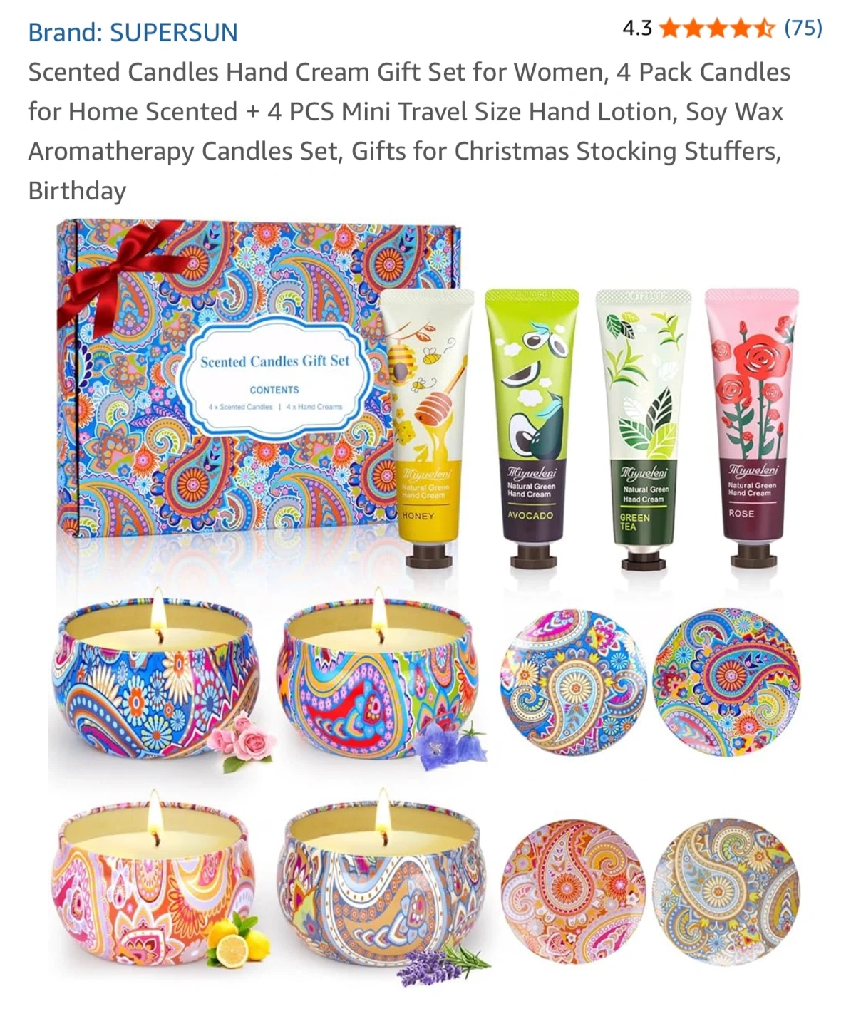 I'm selling a SUPERSUN scented candles and hand cream gift set for women! It comes with 4 pack candles for home scenting and 4 mini travel-size hand lotions. The hand creams are Miyueleni natural green hand creams in honey, avocado, green tea, and rose scents. It's a perfect aromatherapy candles set and gift for Christmas stocking stuffers or birthdays