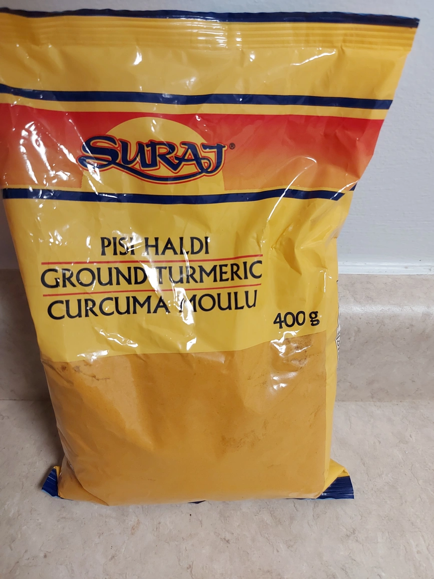 Selling a bag of Suraj Ground Turmeric. It's a 400g bag of ground turmeric. The best before date is 2026 August 19.