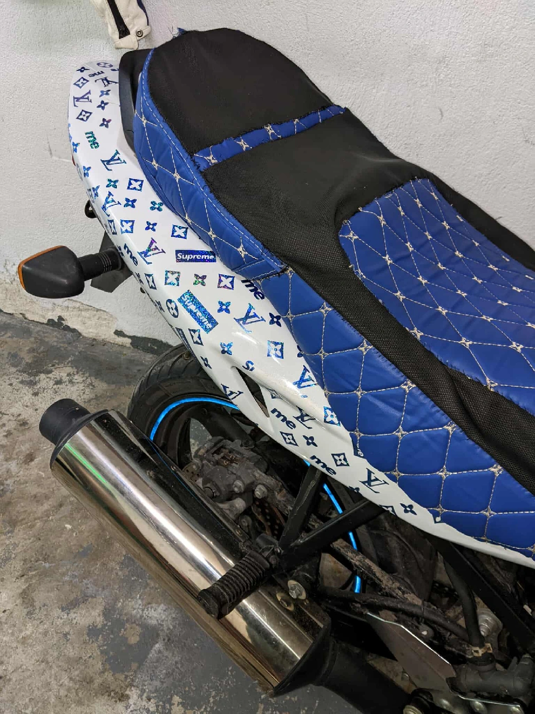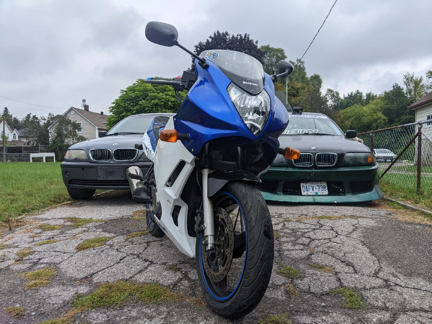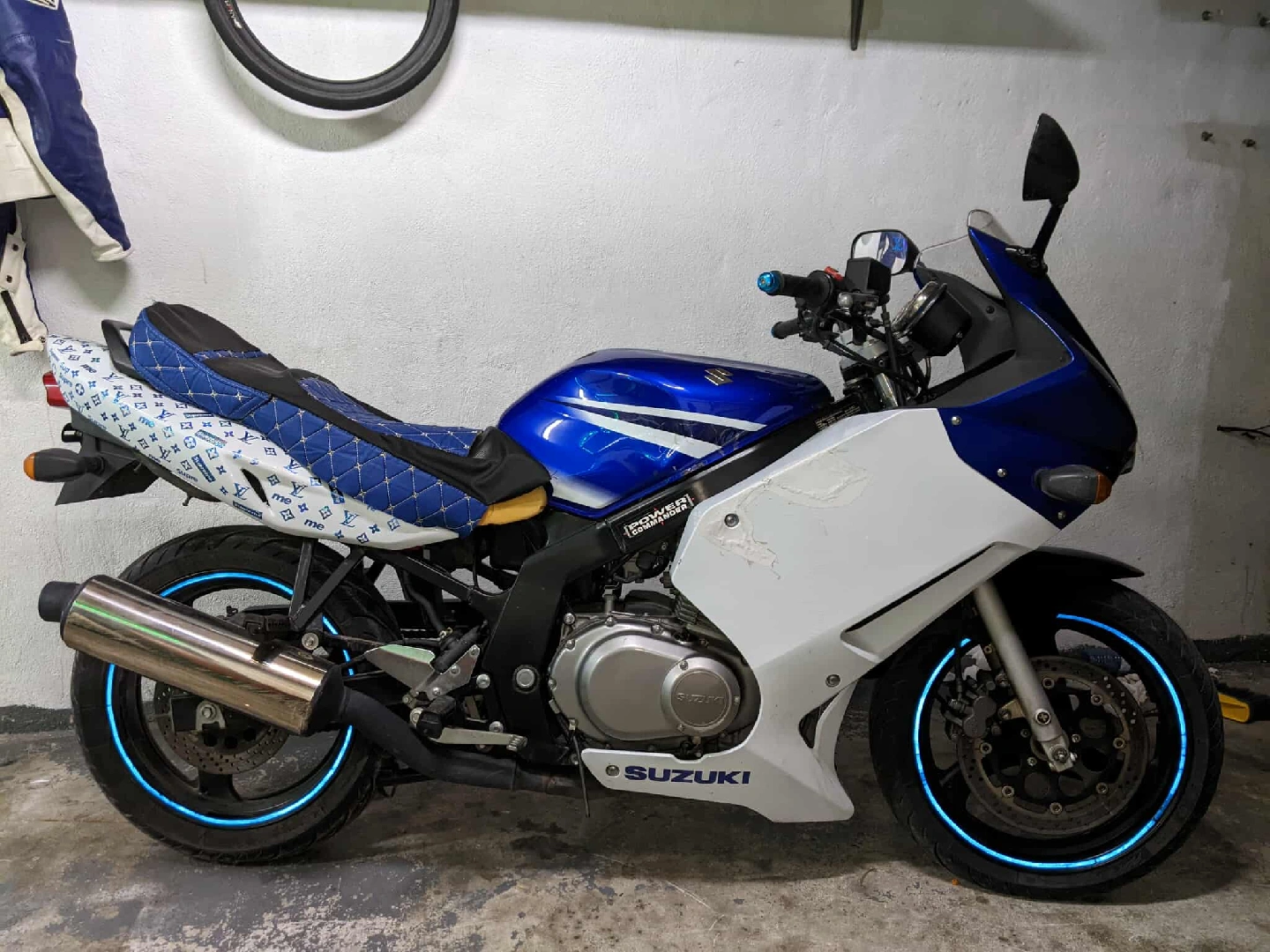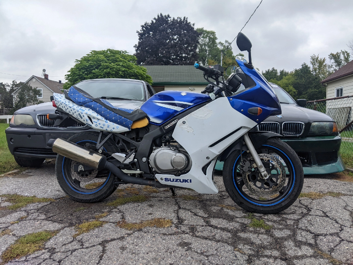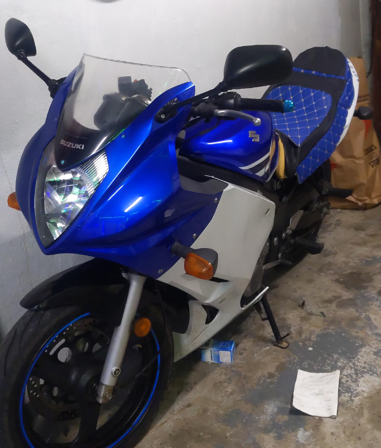 Selling a blue and white Suzuki motorcycle. It's in good condition and ready to ride! comes with Brand New battery! brand new chain! brand new helmet! brand new oil filter! brand. new fork oil. comes with ownership and helmet! will take 2200$