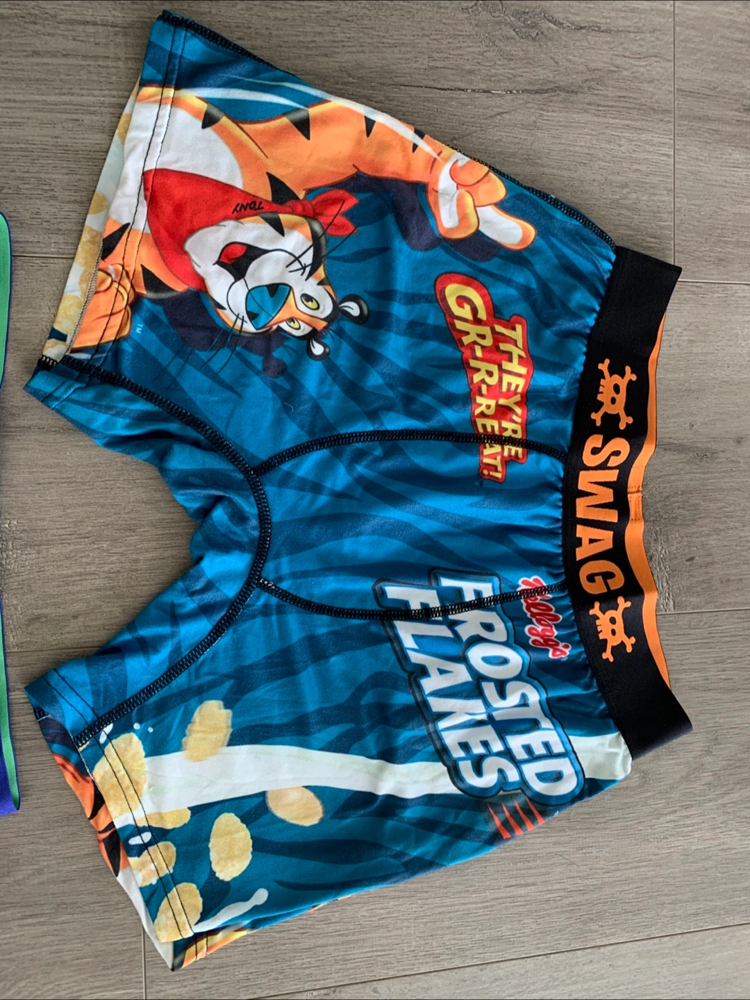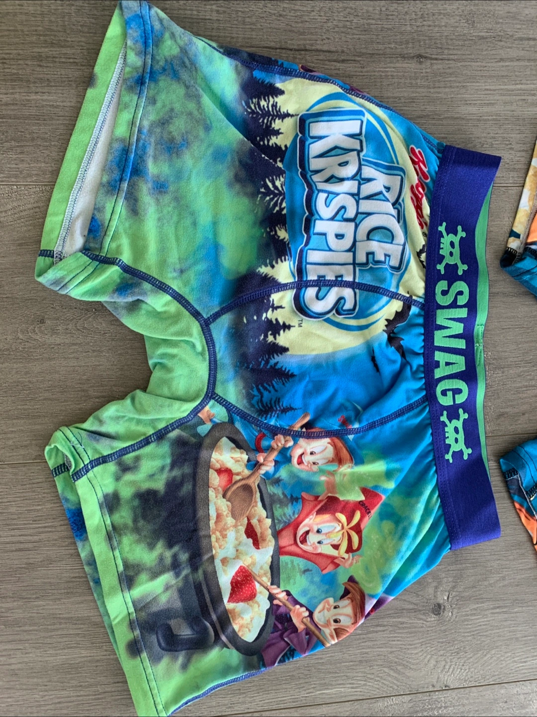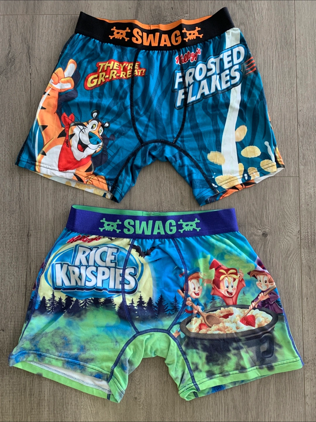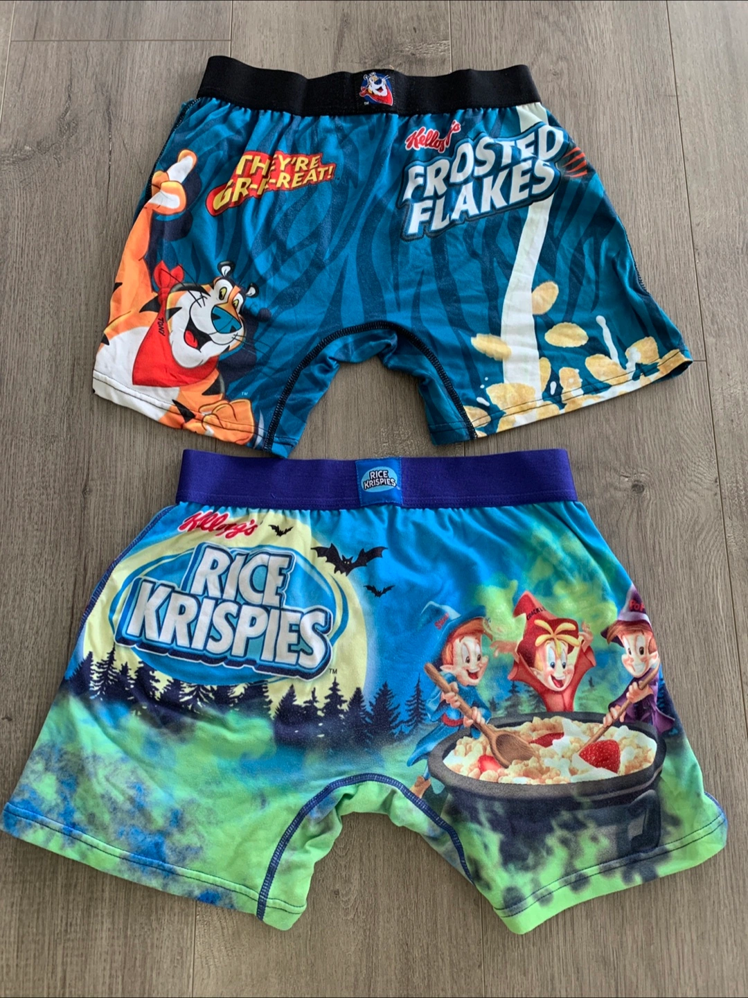 Selling a pair of fun Kellogg's cereal-themed boxer briefs! One pair features Frosted Flakes with Tony the Tiger, and the other has Rice Krispies characters. The brand is on the waistband ‘SWAG'. One new , one washed and excellent condition.