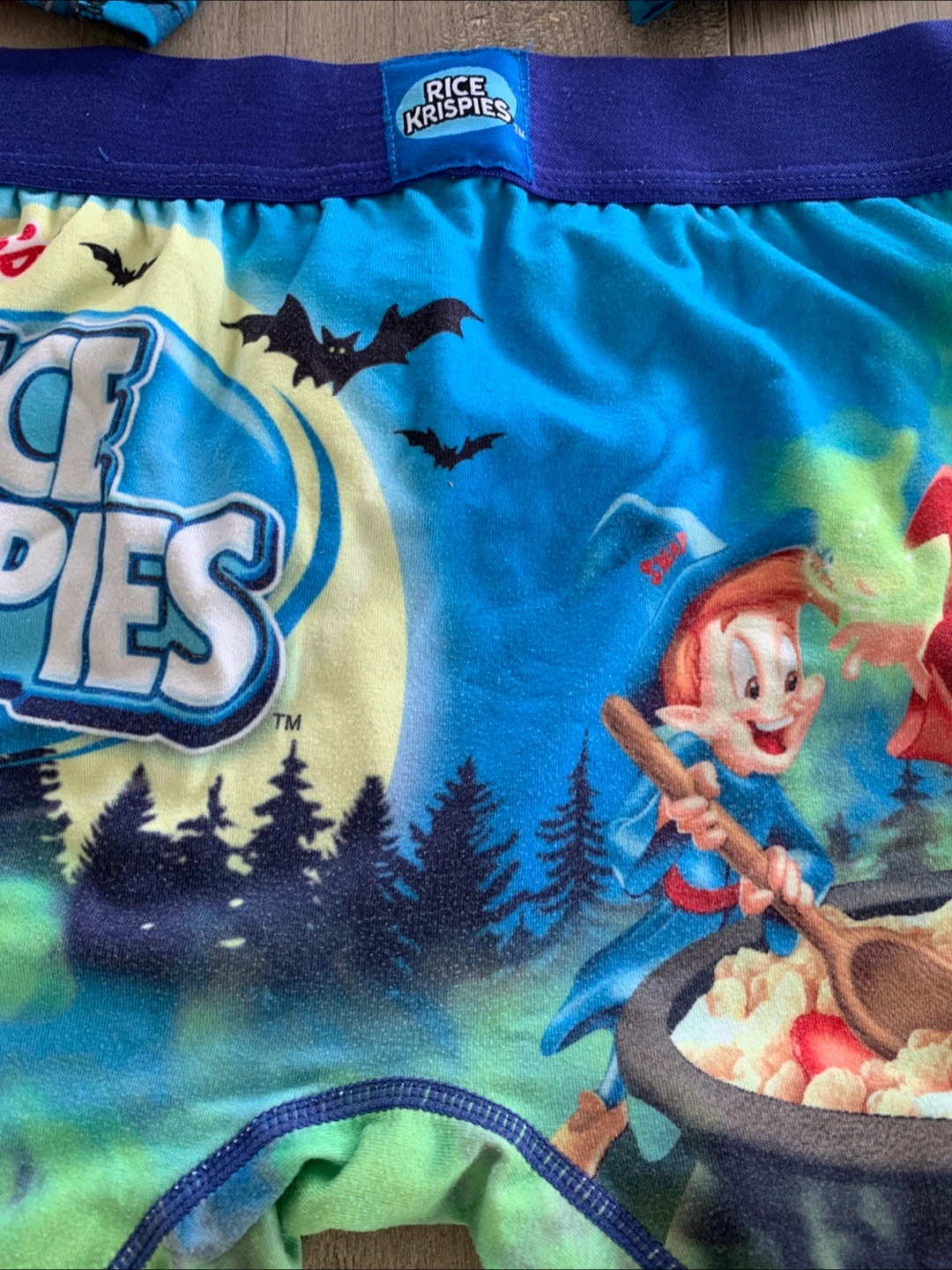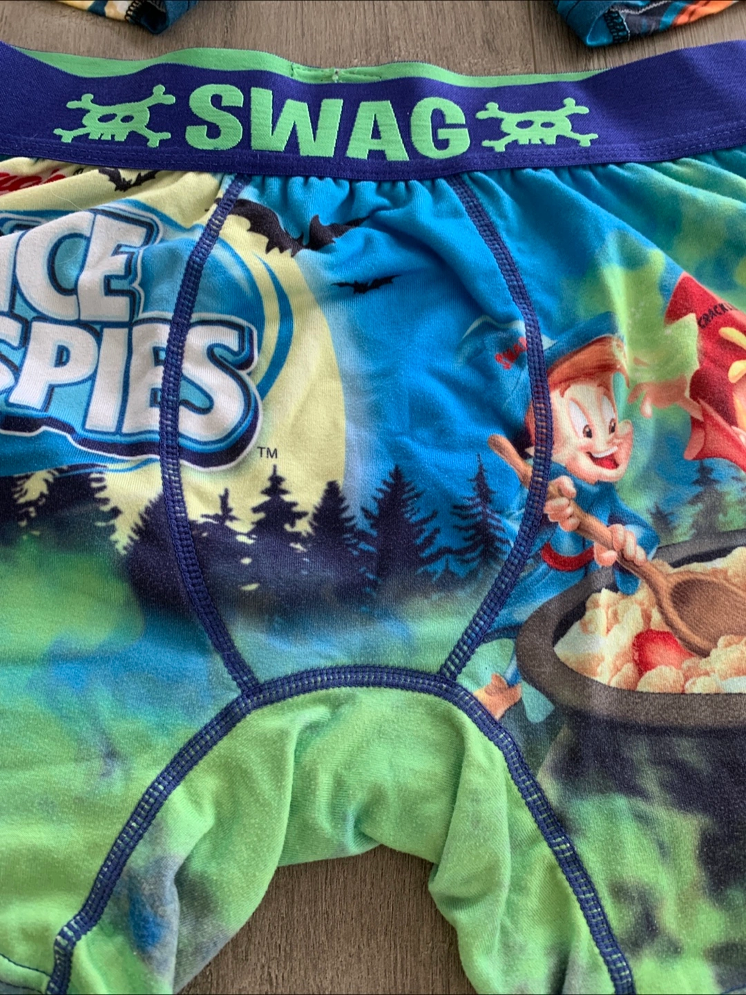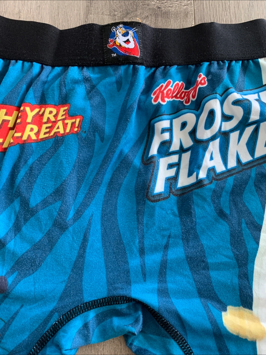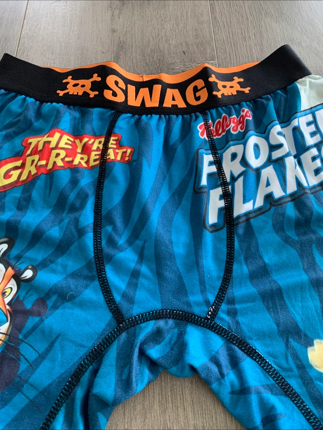 Selling a pair of fun Kellogg's cereal-themed boxer briefs! One pair features Frosted Flakes with Tony the Tiger, and the other has Rice Krispies characters. The brand is on the waistband ‘SWAG'. One new , one washed and excellent condition.