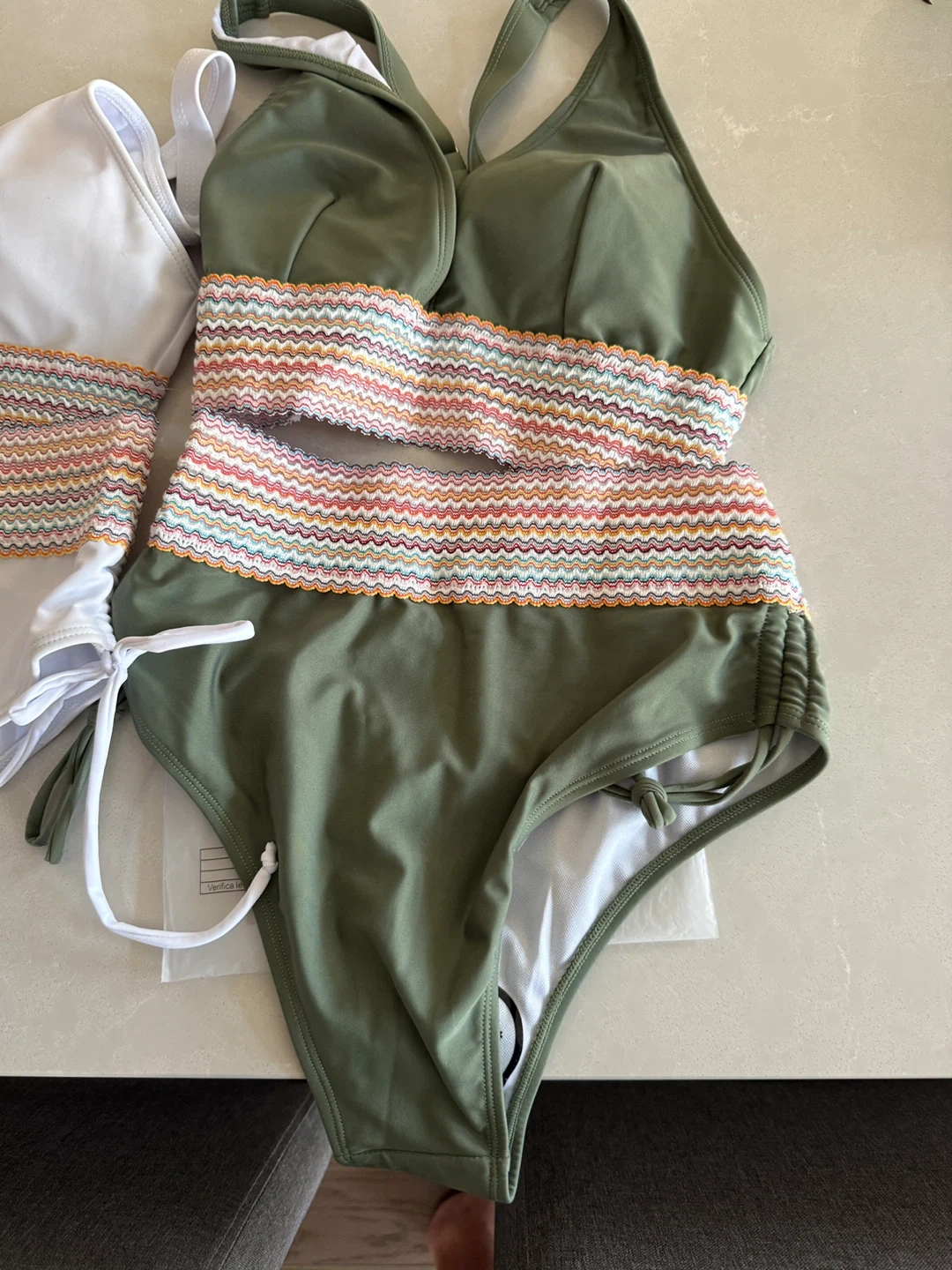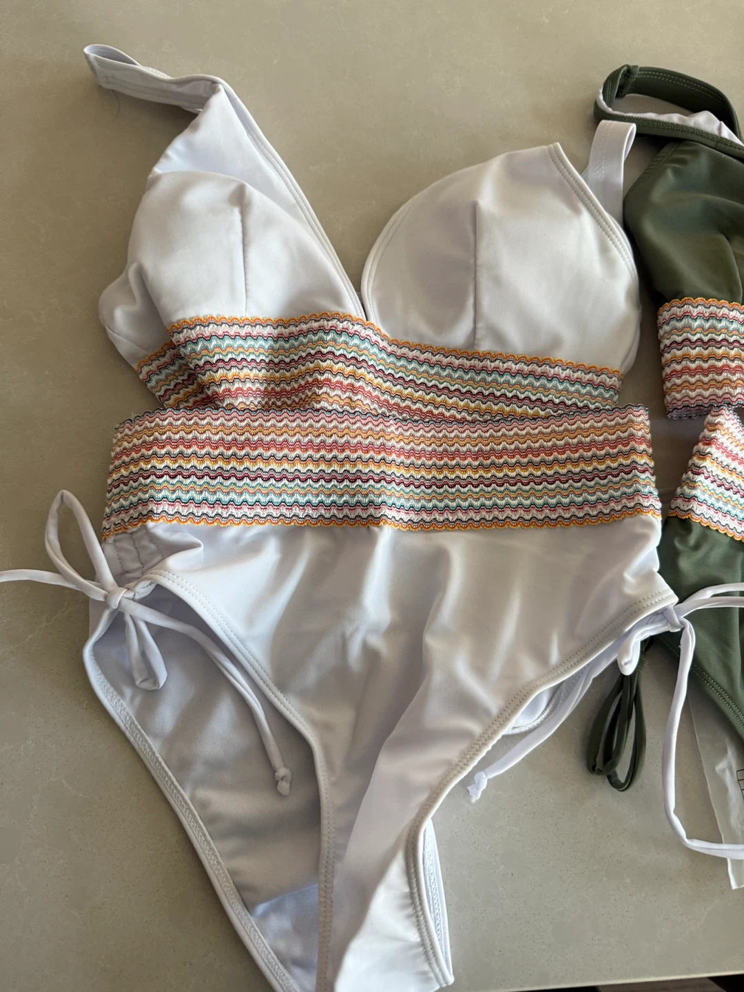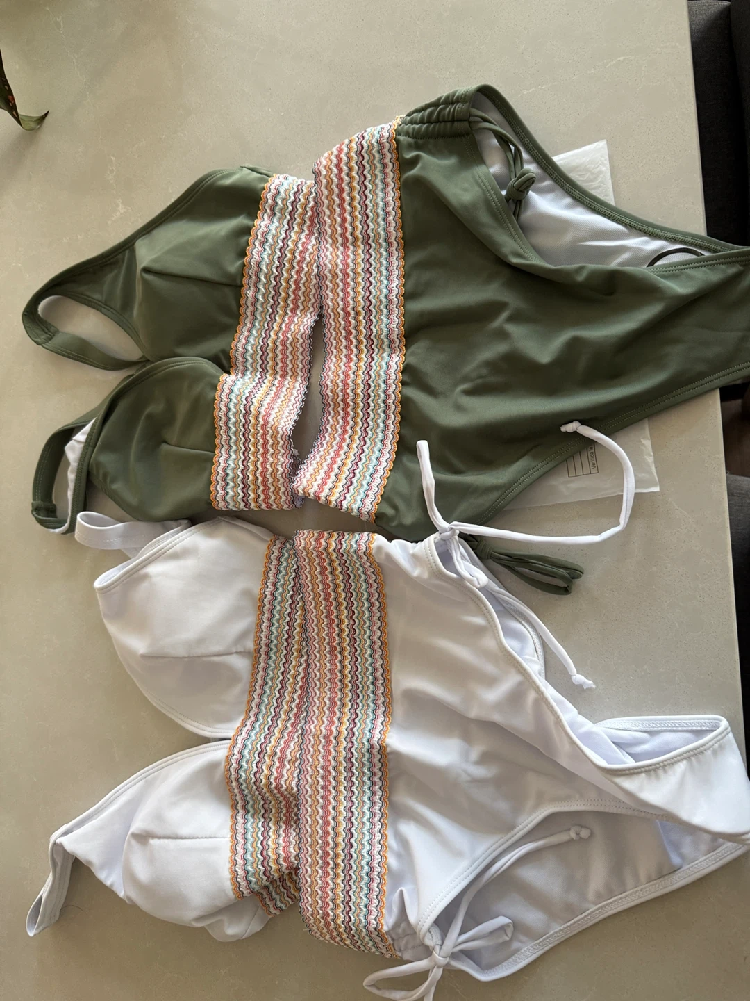 Two swimsuits for sale! One is white and the other is olive green. Both have a colourful patterned band. They're in great condition!