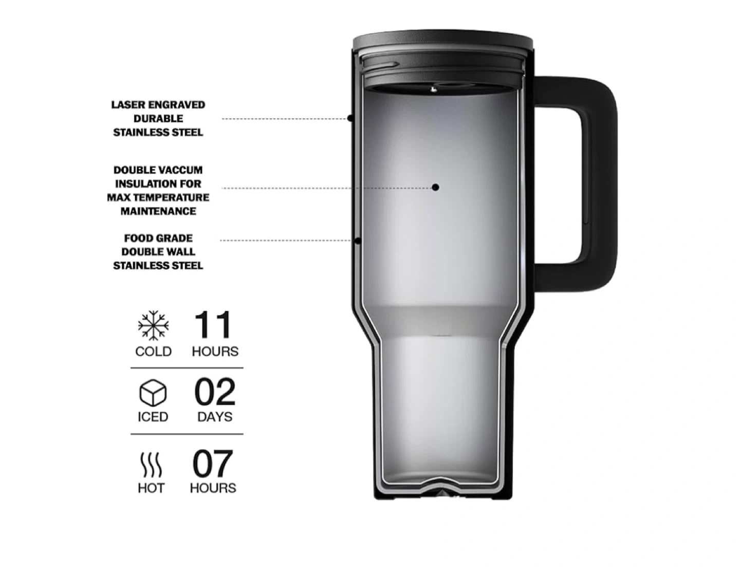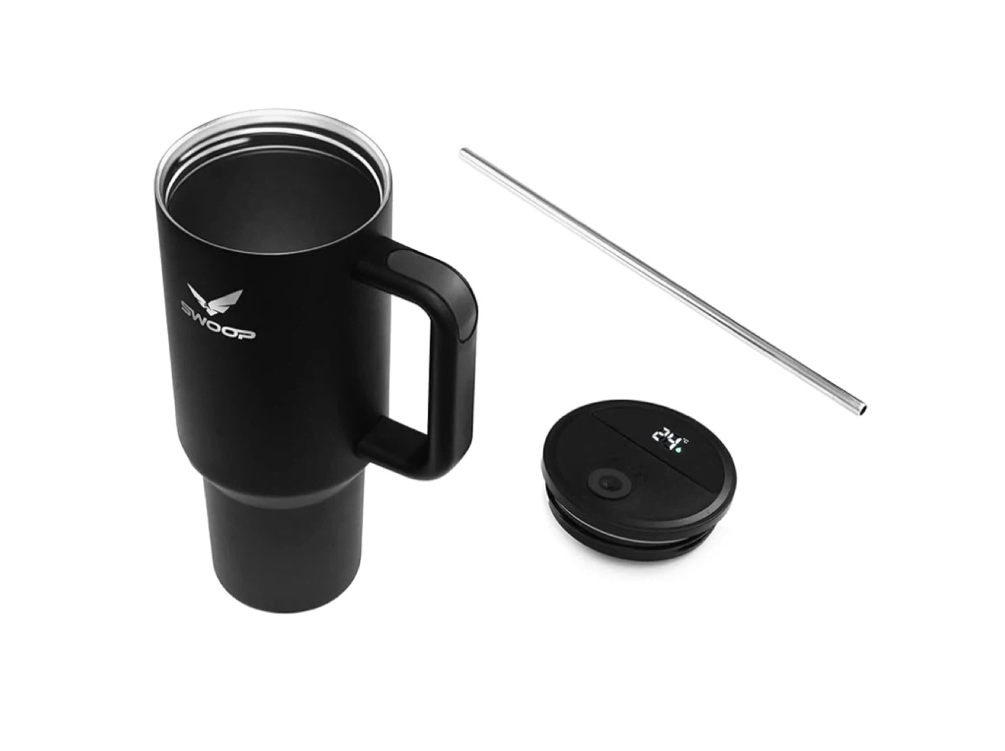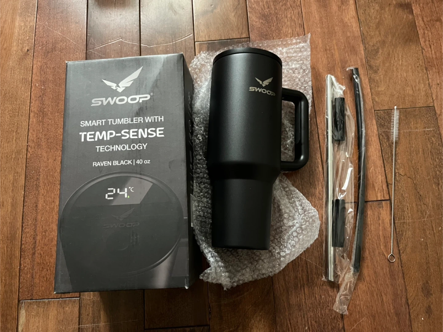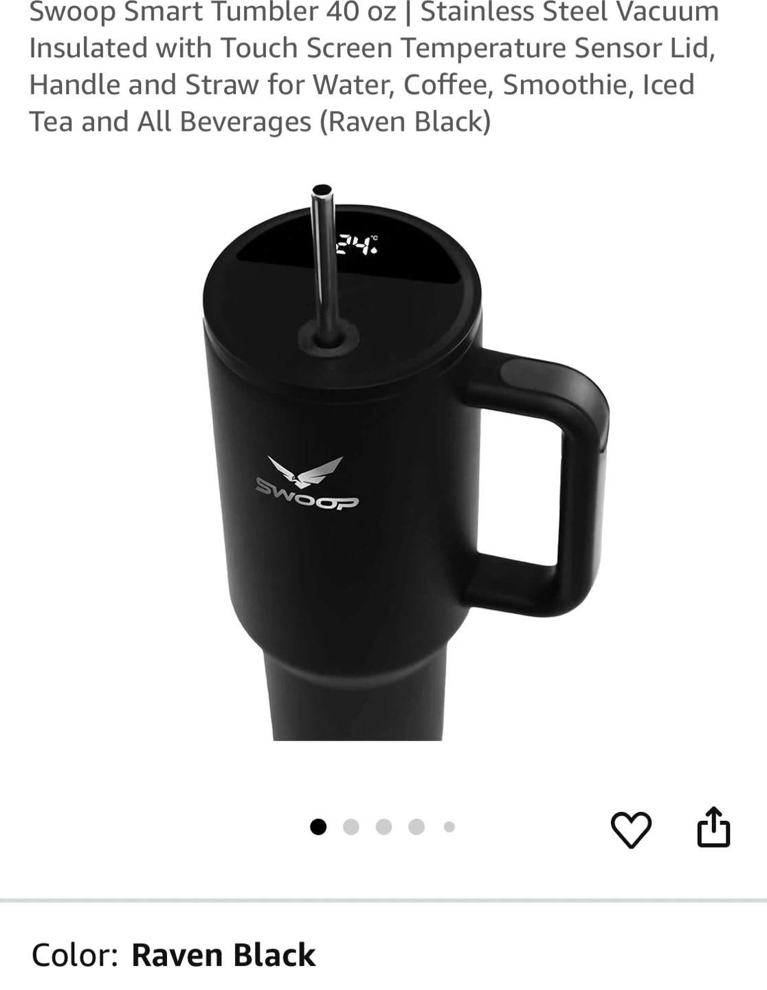 Keep your drinks at the perfect temperature with this Swoop Smart Tumbler! It's a 40 oz stainless steel vacuum insulated tumbler that comes in Raven Black. It features a touch screen temperature sensor lid, handle, and straw, perfect for water, coffee, smoothies, iced tea, and all your favourite beverages. Pickup at Brownridge public school or promenade mall (Bathurst and centre). Cash only