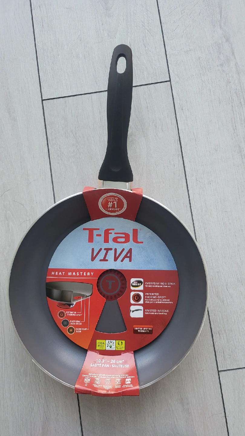 I have a brand new T-fal Viva fry pan for sale! It's 10.3 inches (26cm) and features a non-stick coating for easy cleaning. It's also PFOA free and a recyclable product. Suitable for all heat sources including induction!