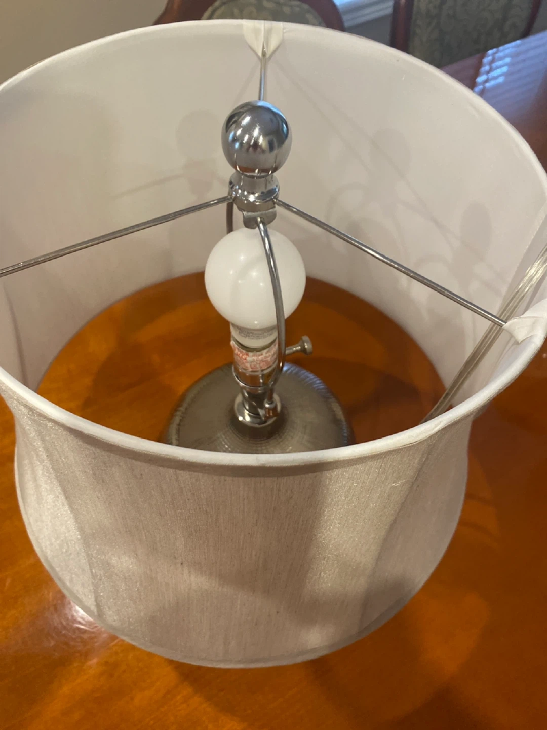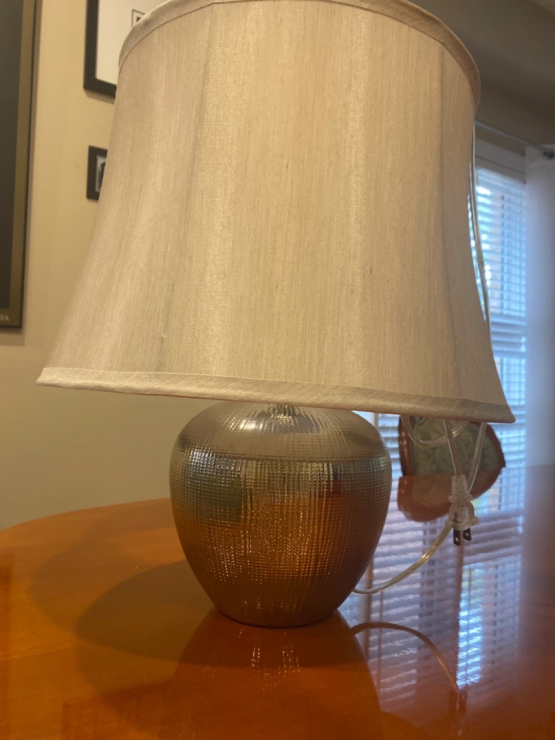 Selling a lovely table lamp with a beige shade. It's in great shape and would look perfect in any room. The base has a unique design that adds a touch of elegance to your space. It's ready to brighten up your home!