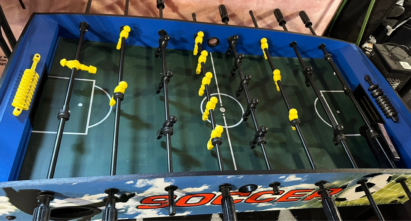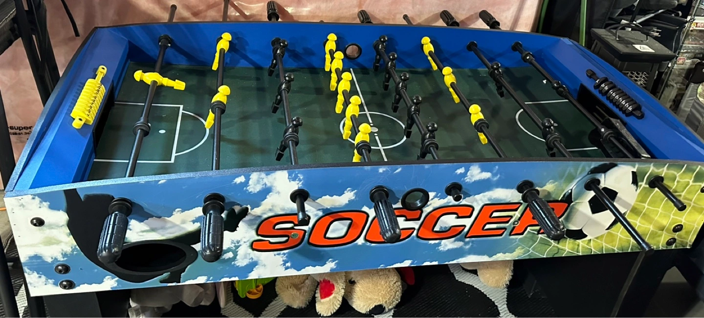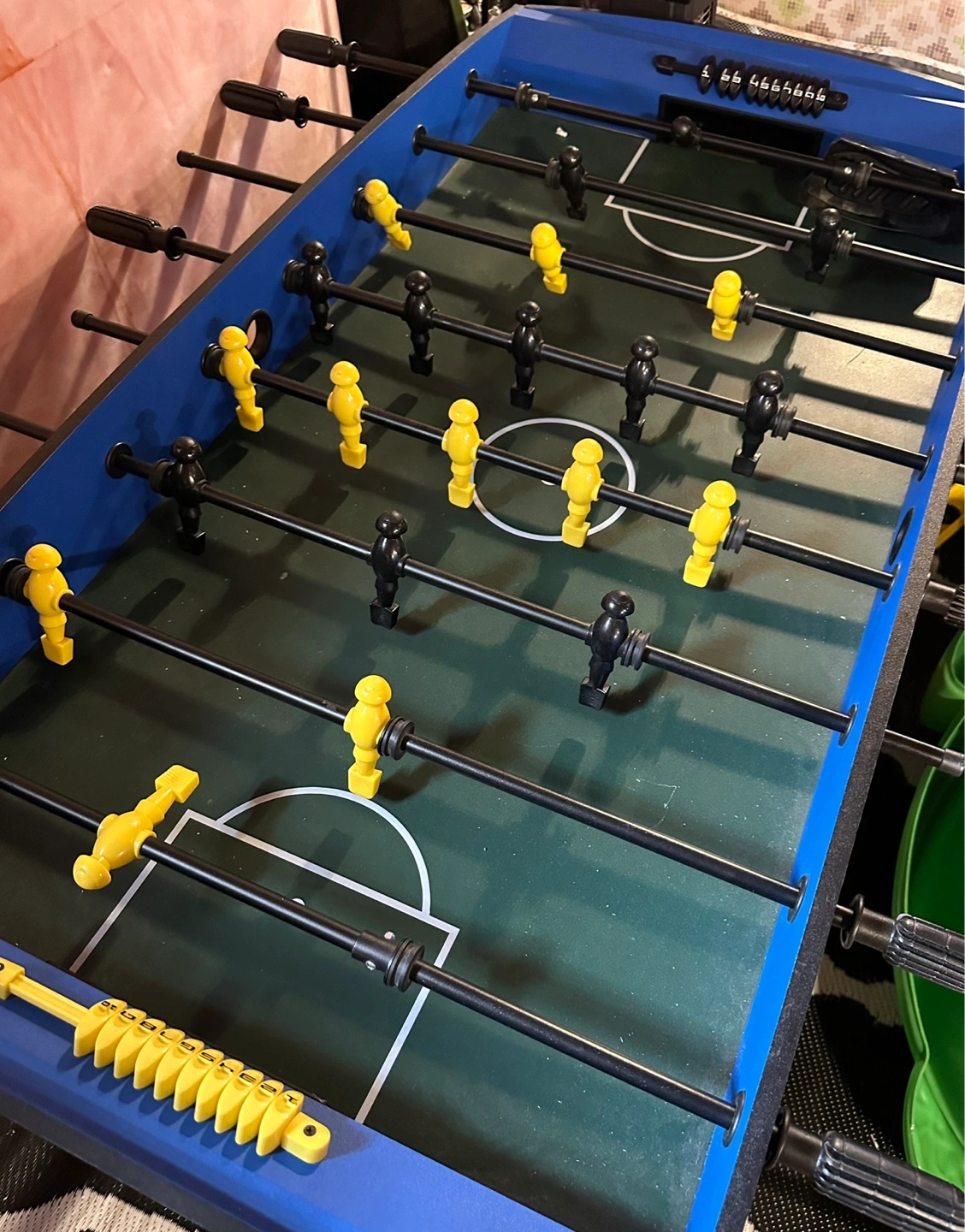 Fun tabletop foosball game. Blue and yellow colour scheme. Great for family fun. Some wear and tear. Freestanding.