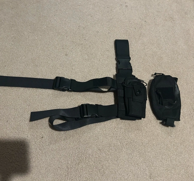 Like new, never used. Tactical thigh drop holster is designed for convenience and accessibility. It features adjustable straps for a comfortable fit and multiple pouches for carrying essential gear. Here are some additional features: * Adjustable thigh straps * Quick-release buckles * Multiple accessory pouches Great for paintball or airsoft.