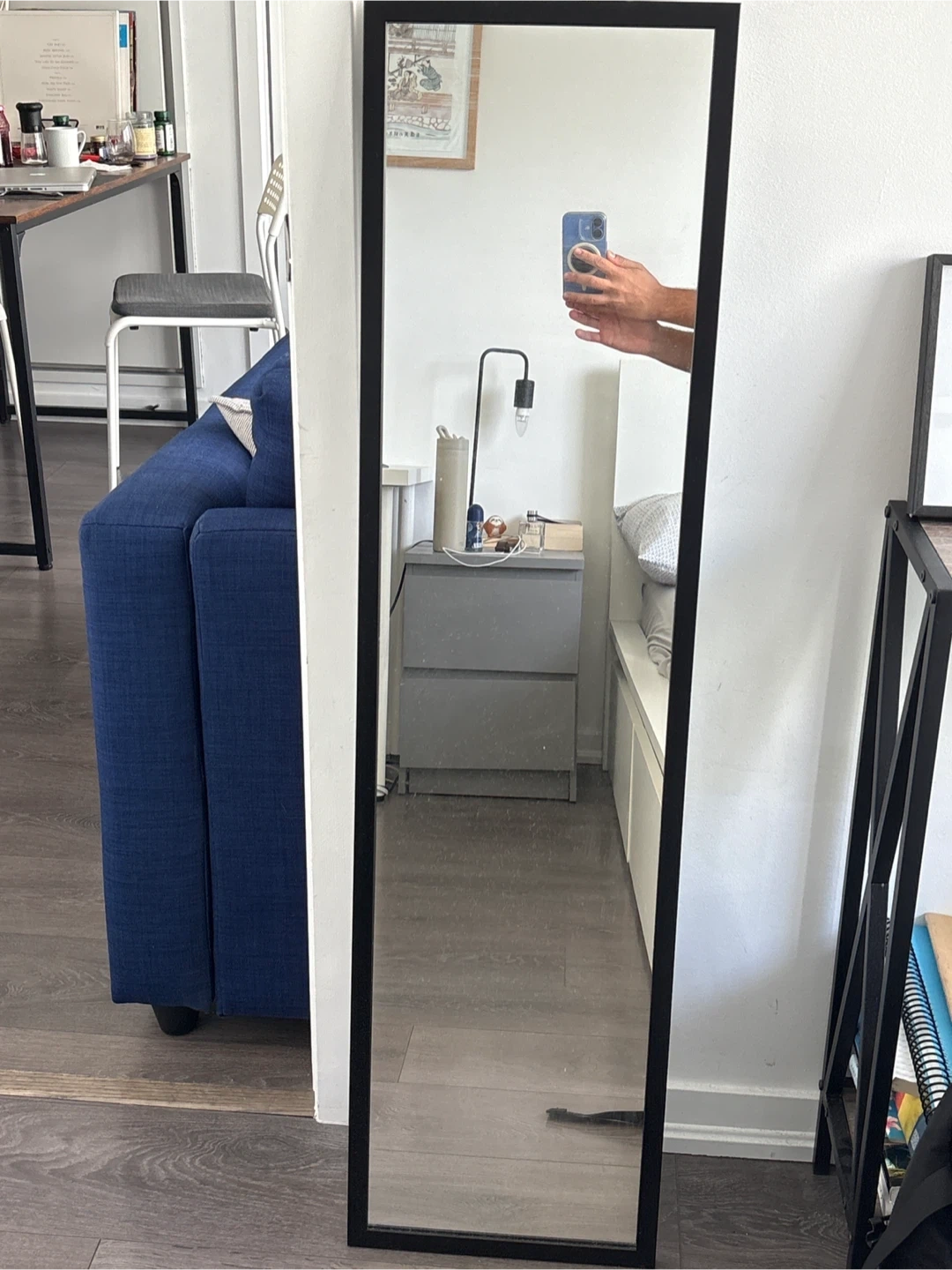 Selling a tall mirror with a sleek black frame. It's in great shape and ready to brighten up your space!
