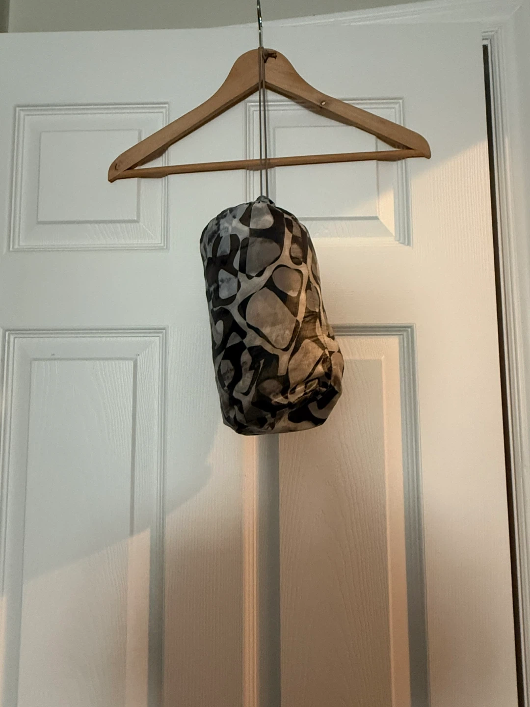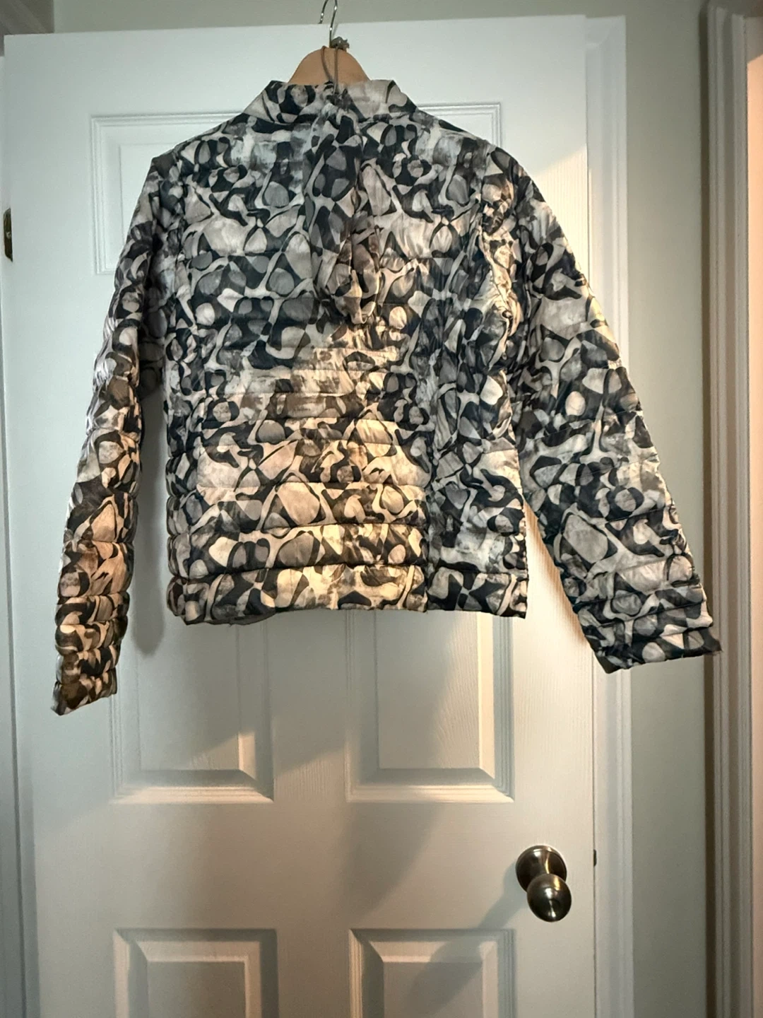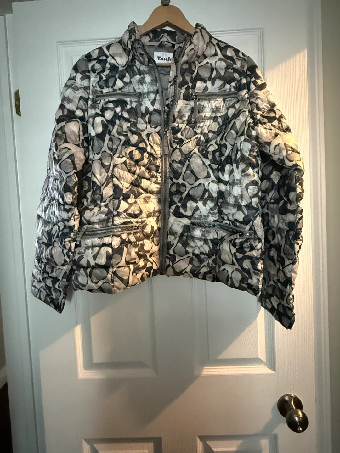 Selling a Tanja puffer jacket with a unique black and white pattern. It's lightweight and perfect for layering. The jacket is in great condition and ready for a new home!