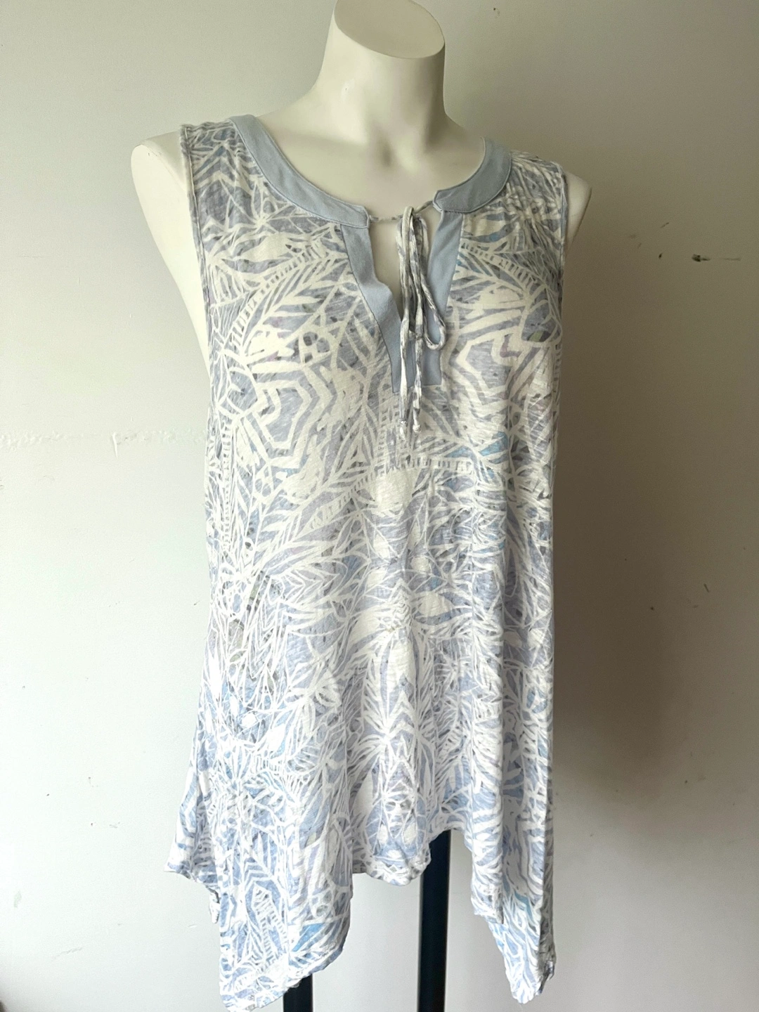 A pretty tank top with a unique blue and white pattern! It's perfect for summer days or layering under a cardigan. It's in great condition and ready for a new home. Size large Pick up: Steveston North
