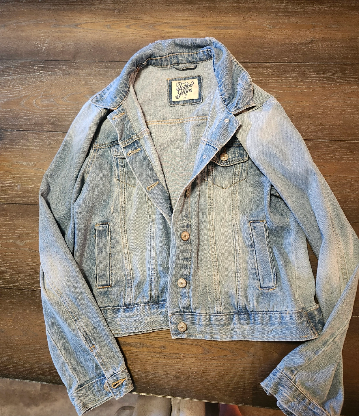 Selling a light wash denim jacket from Tattoo Jeans. It's in great condition and a size L/G. Perfect for layering or adding a casual touch to any outfit!