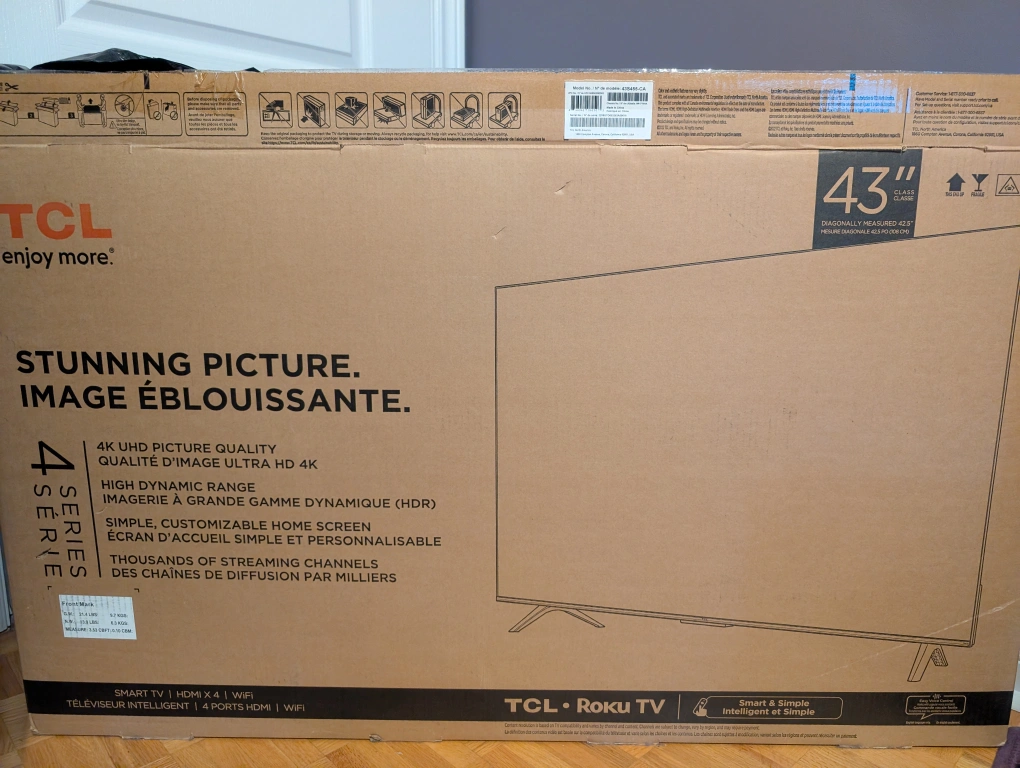 Selling a TCL 4-Series 43" 4K UHD HDR Roku Smart TV. Key features: - 4K UHD Picture Quality - High Dynamic Range (HDR) - Simple, Customizable Home Screen - Thousands of Streaming Channels It has Smart TV | HDMI X 4 | WIFI Like new. No scratches, no marks. Works perfectly well. Selling because moving to India