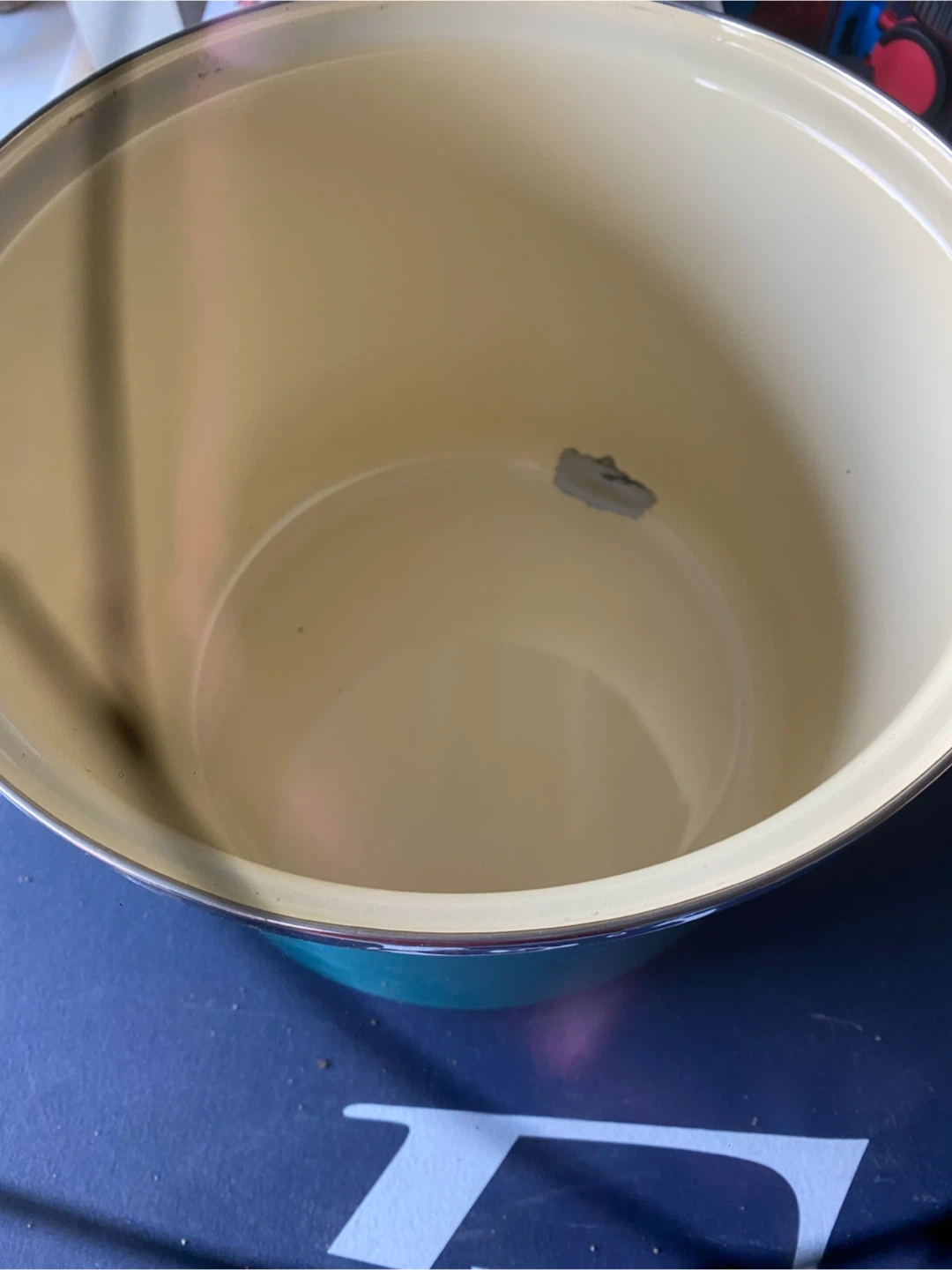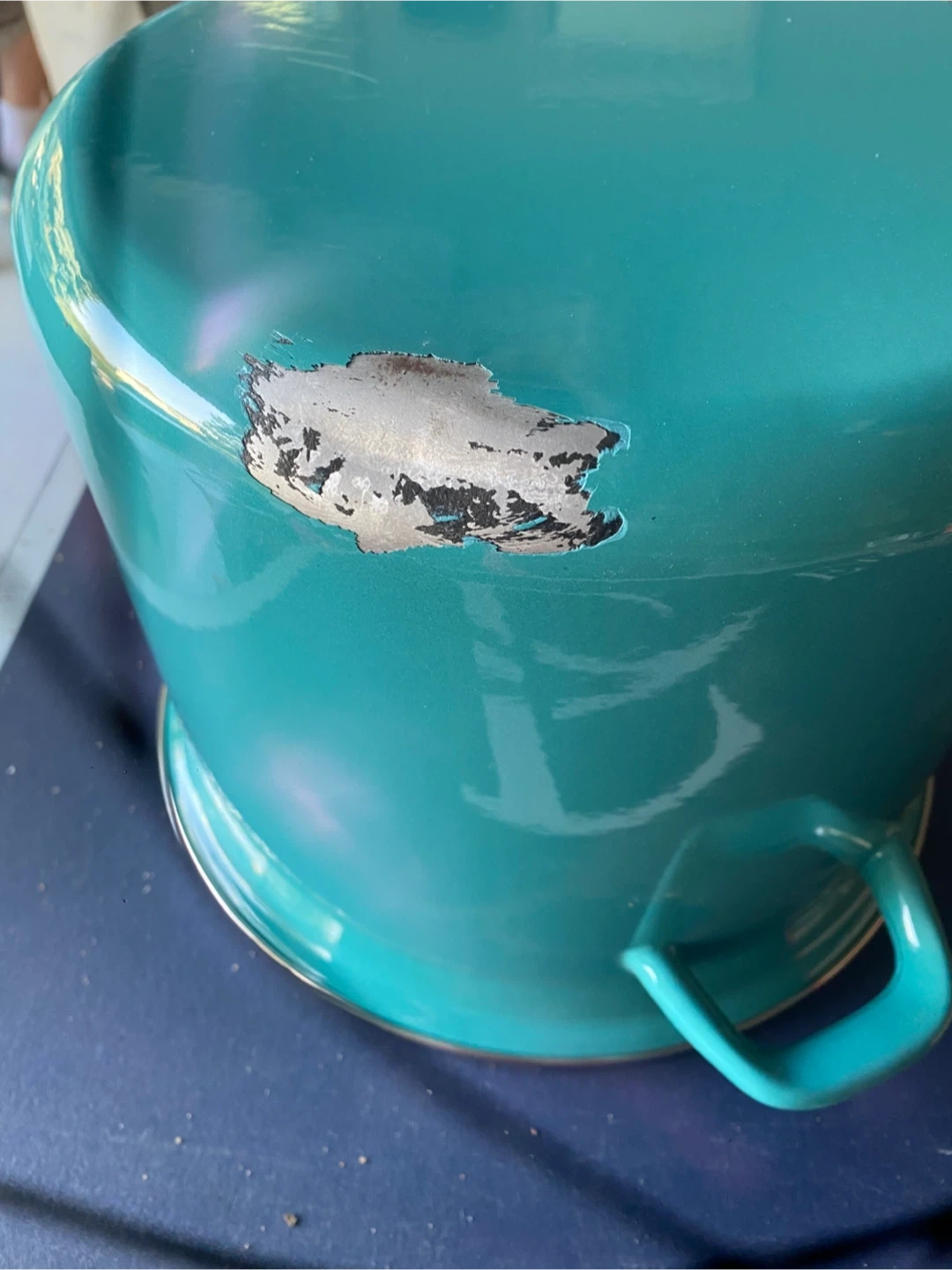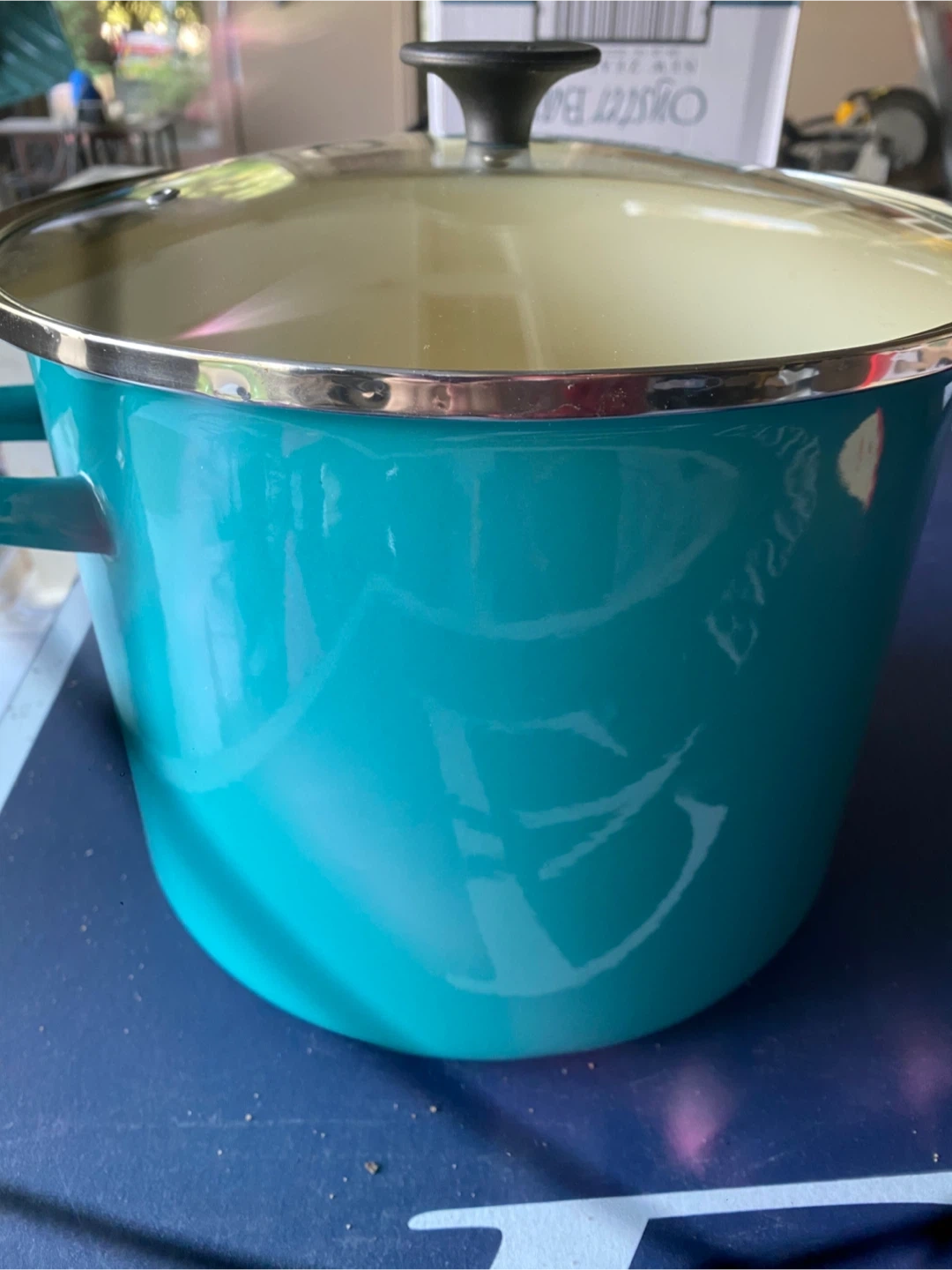 Selling a teal stock pot with a lid. It has some wear and tear, as shown in the photos, but it's still perfectly functional for cooking up your favourite soups and stews