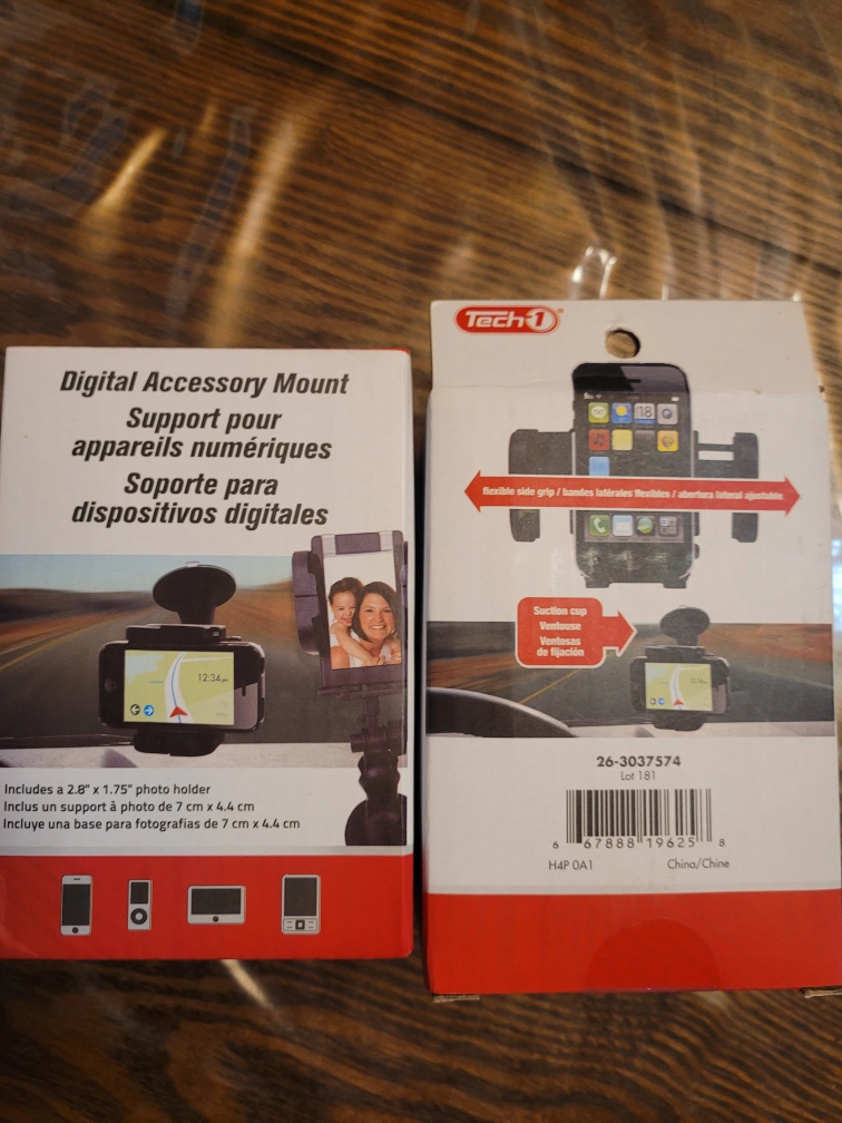 Selling 2 brand new Tech1 Digital Accessory Mount, still in its original packaging! This mount supports digital devices and includes a 2.8" x 1.75" photo holder. It also features a flexible side grip and a suction cup for easy installation. Perfect for keeping your device secure while on the go. Price is for both.