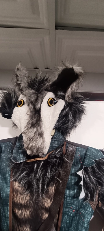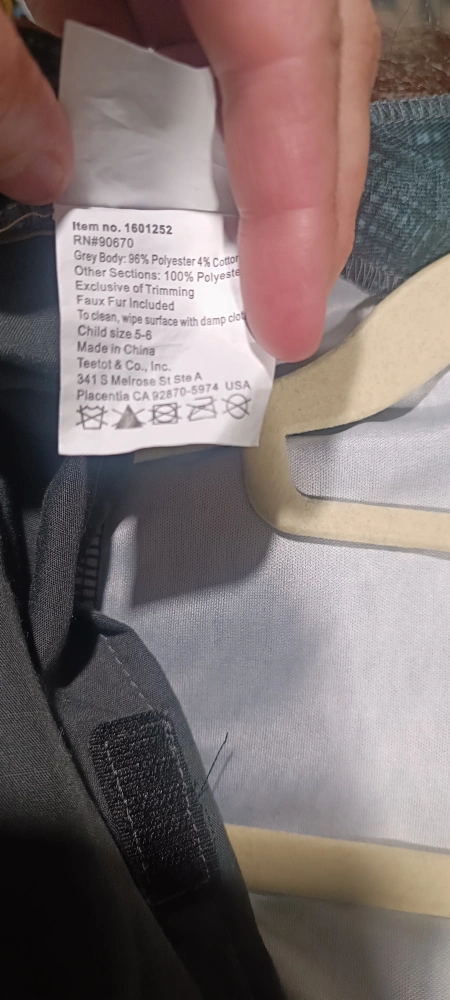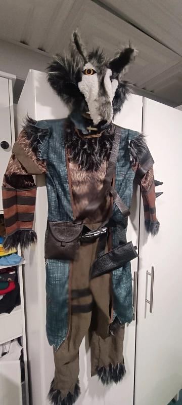 Selling a Teetot & Co. wolf costume, perfect for dress-up or Halloween! It's a child's size 5-6. The costume features a grey body made of 96% polyester and 4% cotton, with other sections made of 100% polyester. It also includes faux fur detailing. To clean, simply wipe the surface with a damp cloth