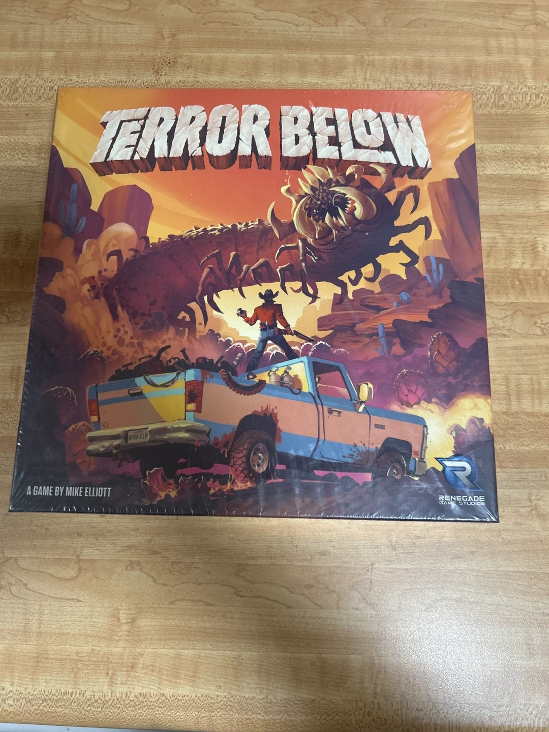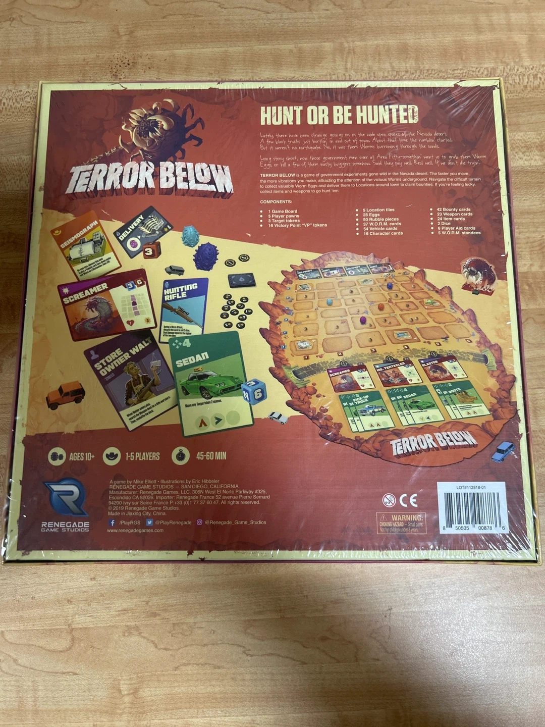 Selling a copy of Terror Below by Renegade Game Studios! It's a game of government experiments gone wild in the Nevada desert. The goal is to collect valuable Worm Eggs and deliver them to locations around town to claim bounties. Includes location tiles, player boards, worm minis, bounty cards, and more. Suitable for 1-5 players, ages 10+ and each game takes 45-60 minutes Brand new in Box! Never played!