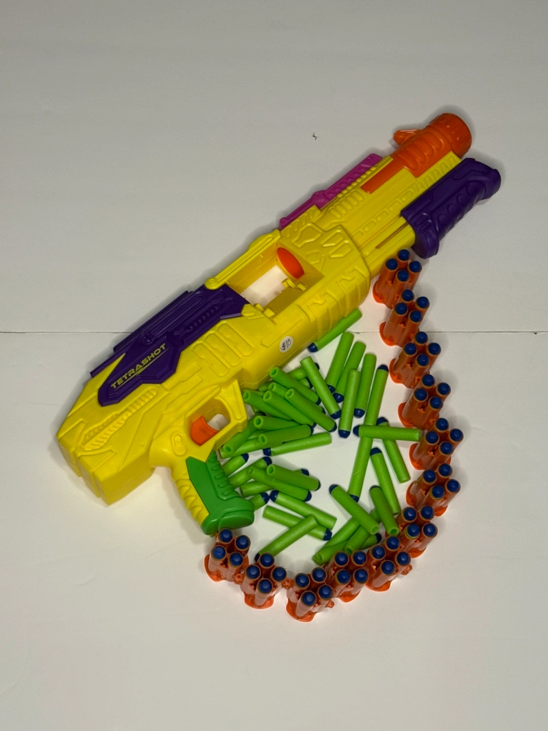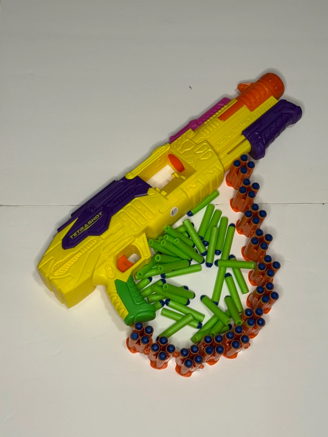 Selling a Tetra Shot dart blaster toy gun in yellow, purple, orange, and green! Comes with a bunch of green darts and an orange dart belt. Great for kids!