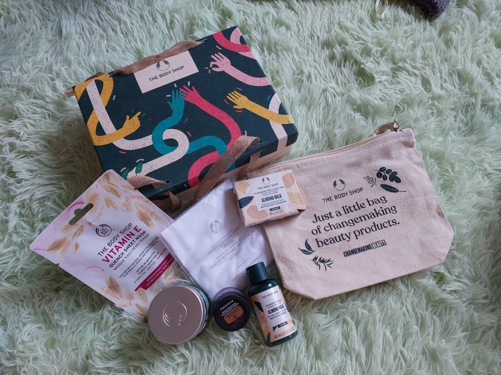 The Body Shop gift set includes a cleansing bar, shower cream, face mask, massage cream and cleansing cloth. All items are unopened and new. You can get everything for $40 or price for each is: Vit. E Face Mask & Cleansing Cloth - $5 Nicaraguan Coffee Mask - $5 Almond Milk Shower Cream - $10 Almond Milk Cleansing face & body bar - $15 Eucalyptus & Rosemary Massage Cream - $20 Bag & Box - $5
