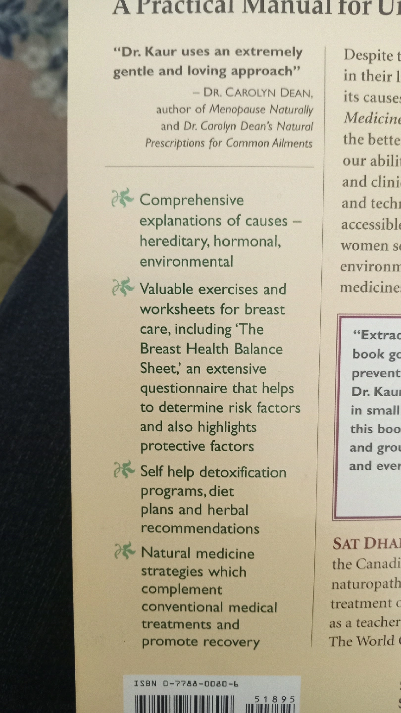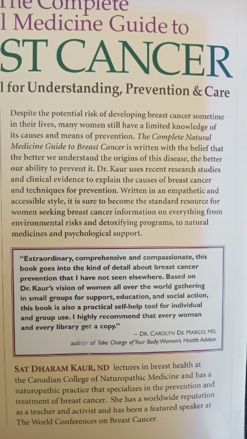 Selling "The Complete Natural Medicine Guide to Breast Cancer" by Sat Dharam Kaur. It's a practical manual for understanding, prevention, and care. This book uses recent research studies and clinical evidence to explain the causes of breast cancer and techniques for prevention. It's written in an empathetic and accessible style, making it a standard resource for women seeking breast cancer information