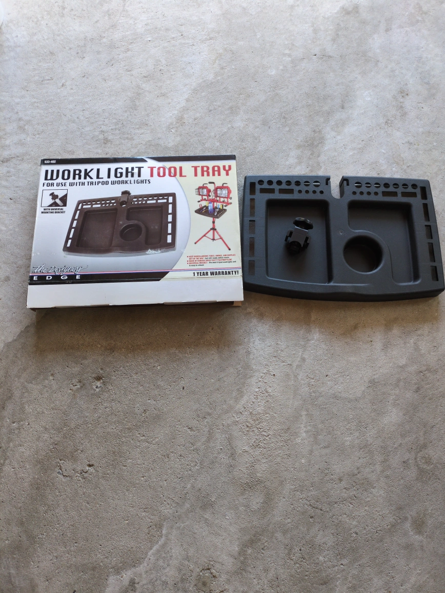Selling a worklight tool tray by The Destiny Edge! It's designed for use with tripod worklights and features a universal mounting bracket. Comes with the original box. brand new never used