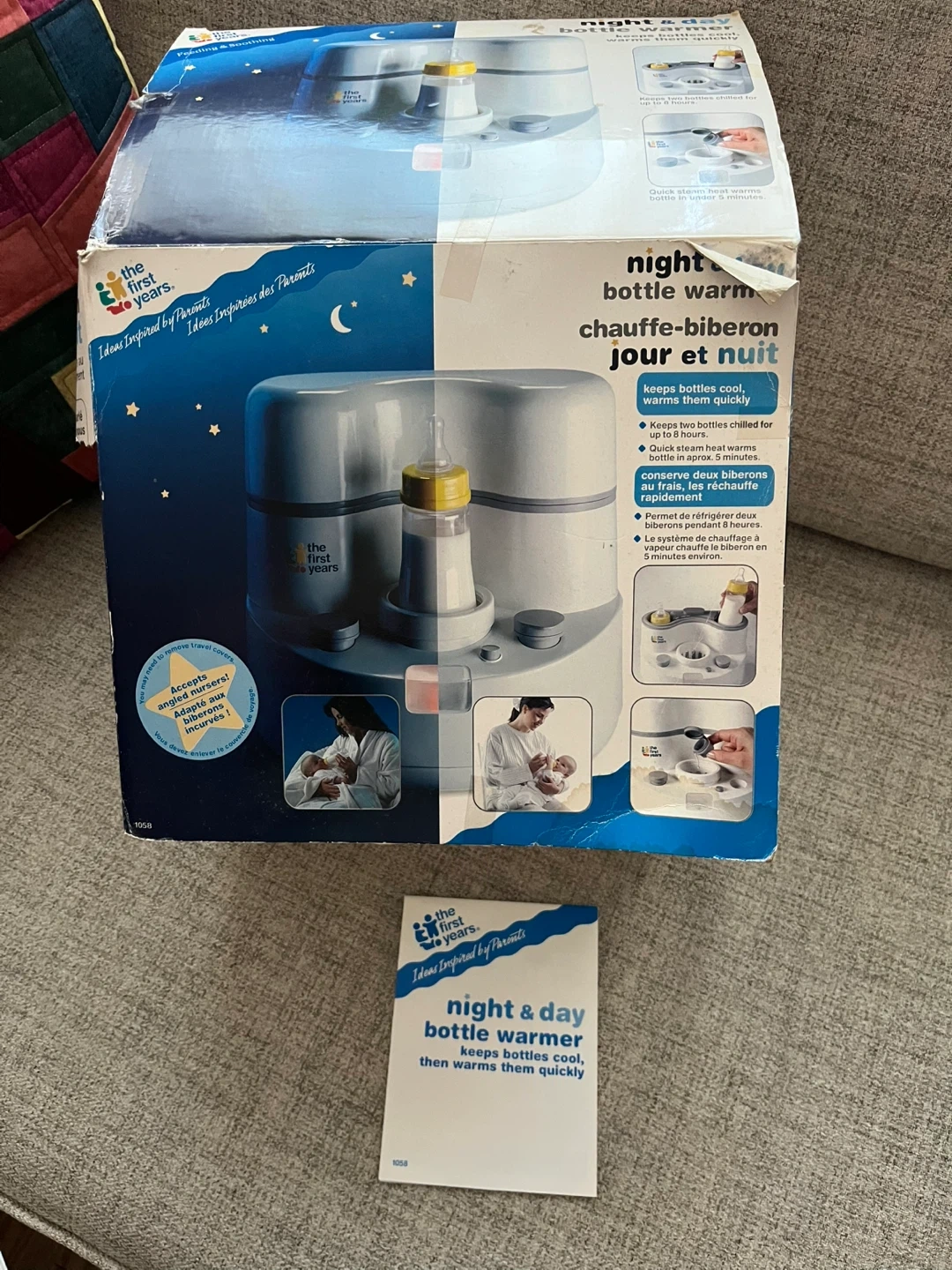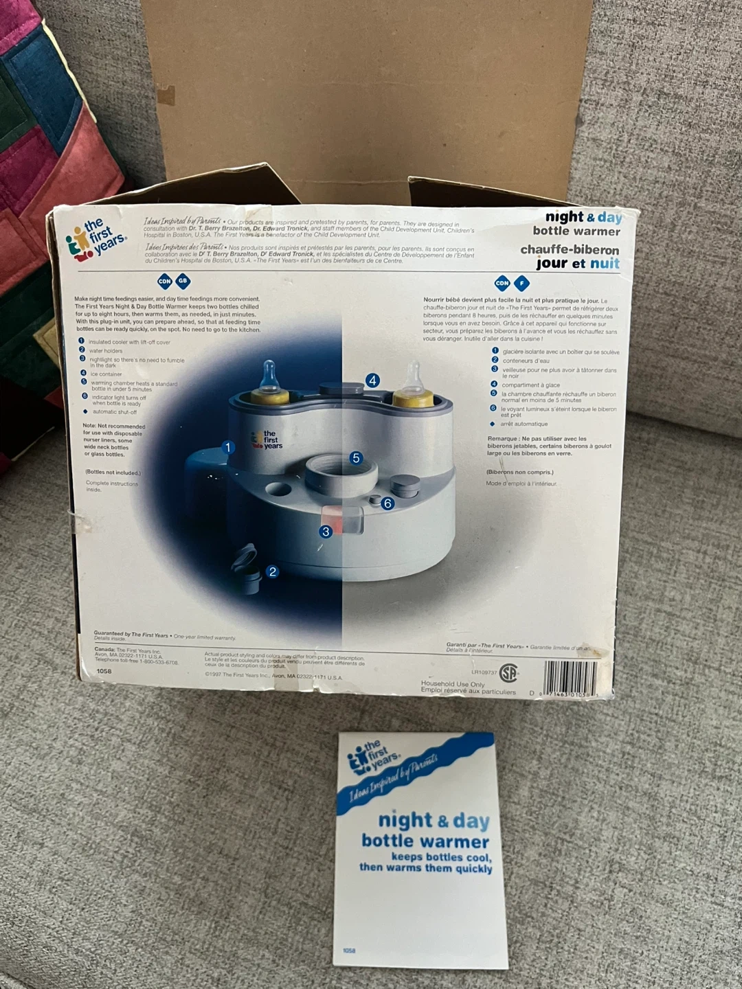 Keep your baby's bottle warm and ready with The Bottle Warmer! It keeps bottles cool, then warms them quickly. It makes night time feedings easier and day time feedings more convenient. The bottle warmer keeps a bottle warm for up to 8 hours, then warms it in just minutes. It also includes an insulated cooler, so it's not necessary to run to the kitchen. Picture included plugged in and lit up showing it works.