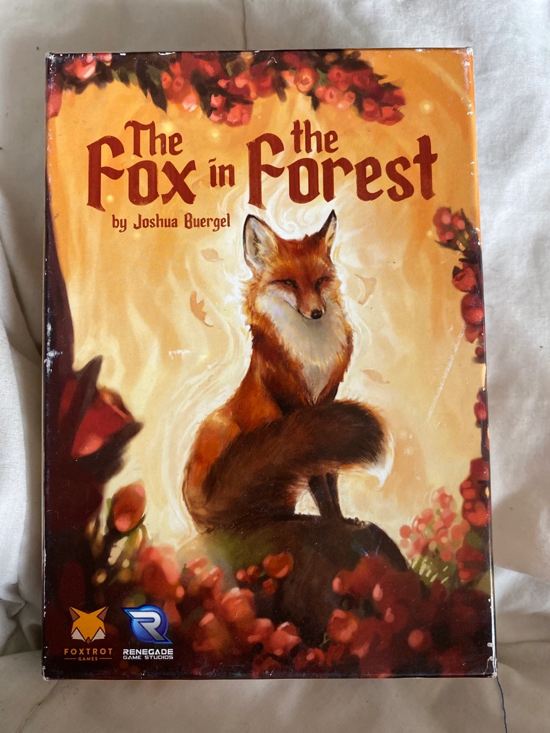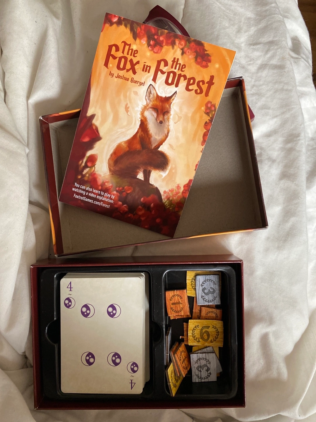 The Fox in the Forest is a trick-taking card game for two players by Joshua Buergel. It includes 33 game cards and 17 scoring tokens. Recommended for ages 10+