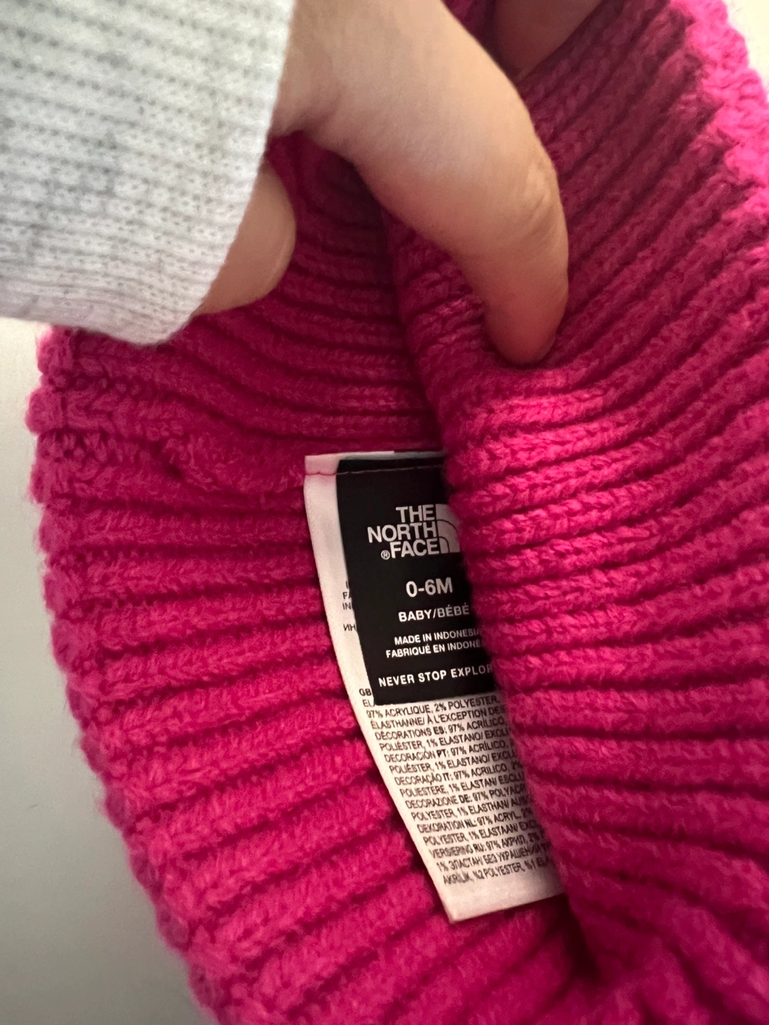 worn only once.Keep your little one warm with this adorable The North Face baby beanie! It's sized for 0-6 months and is a vibrant pink colour. Made from 97% acrylic and 3% polyester, it's soft and cozy for your baby's delicate skin
