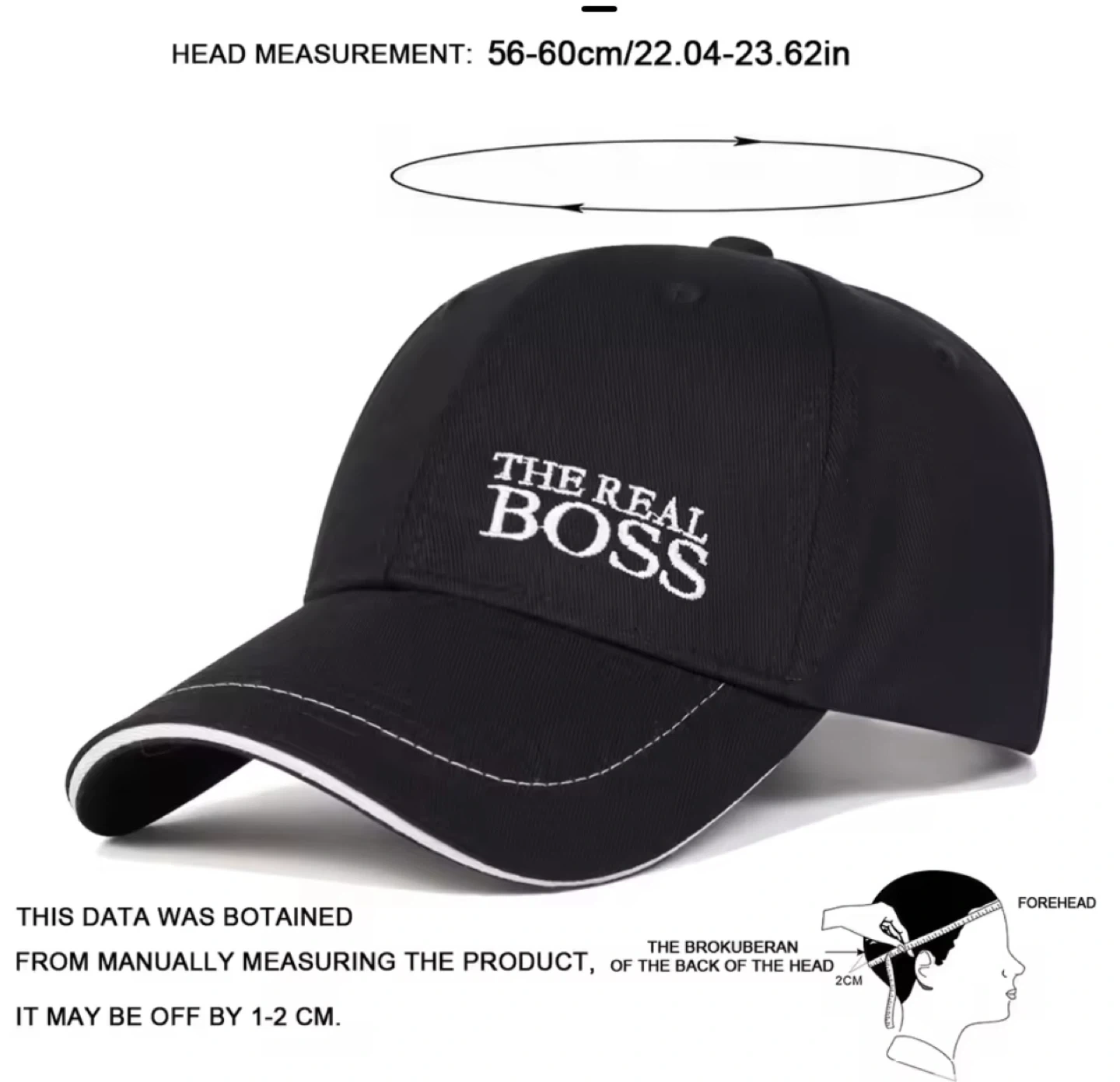 Selling a white baseball cap with "The Real Boss" embroidered on the front! It's in great condition. The head measurement is approximately 56-60cm (22.04-23.62in)